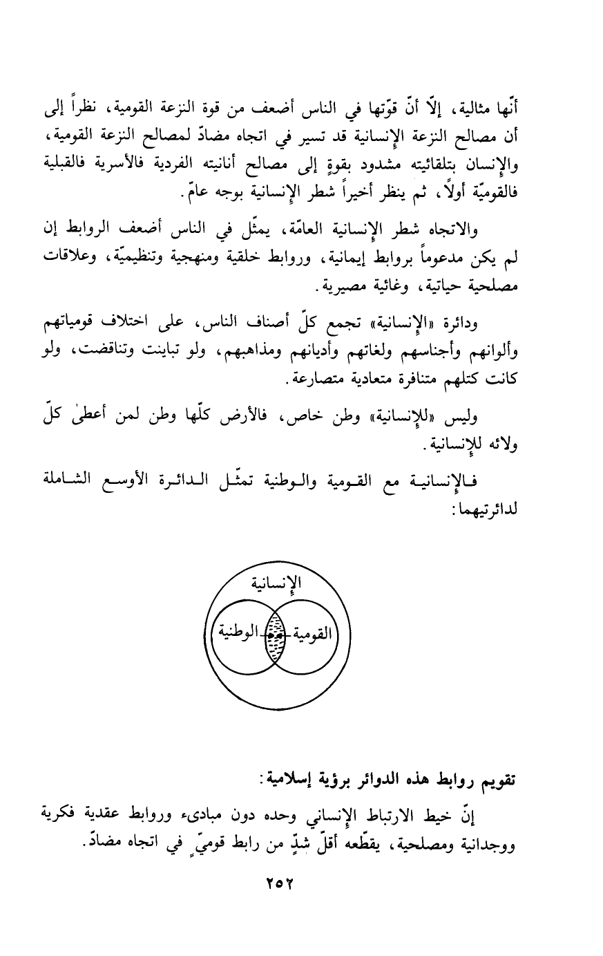 فالإنسانية مع القومية والوطنية تمثل الدائرة الأوسع الشاملة لدائرتيهما: