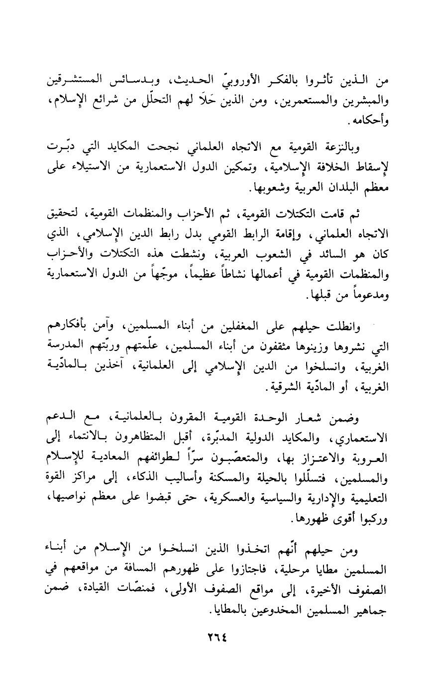 وبالنزعة القومية مع الاتجاه العلماني نجحت المكايد التي دبّرت لإسقاط الخلافة الإسلامية، وتمكين الدول الاستعمارية من الاستيلاء على معظم البلدان العربية وشعوبها.