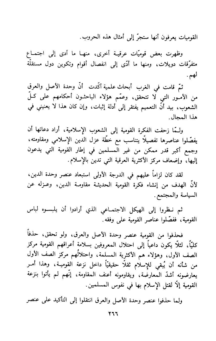 فحذفوا من القومية عنصر وحدة الأصل والعرق، ولو تحقق، حذفاً كليّاً، لئلا يكون داعياً إلى احتلال المعروفين بسلامة أعراقهم القومية مركز الصف الأول، وهؤلاء هم الأكثرية المسلمة، واحتلالُهم مركز الصف الأول من شأنه أن يُبقي للإسلام ثقلاً حقيقيّاً داخل نزعة القومية، وهذا أمر يعارضونه أشدّ المعارضة، ويقاومونه أعنف المقاومة، إنهم لم يأتوا بنزعة القومية إلا لقتل الإسلام بها في نفوس المسلمين.