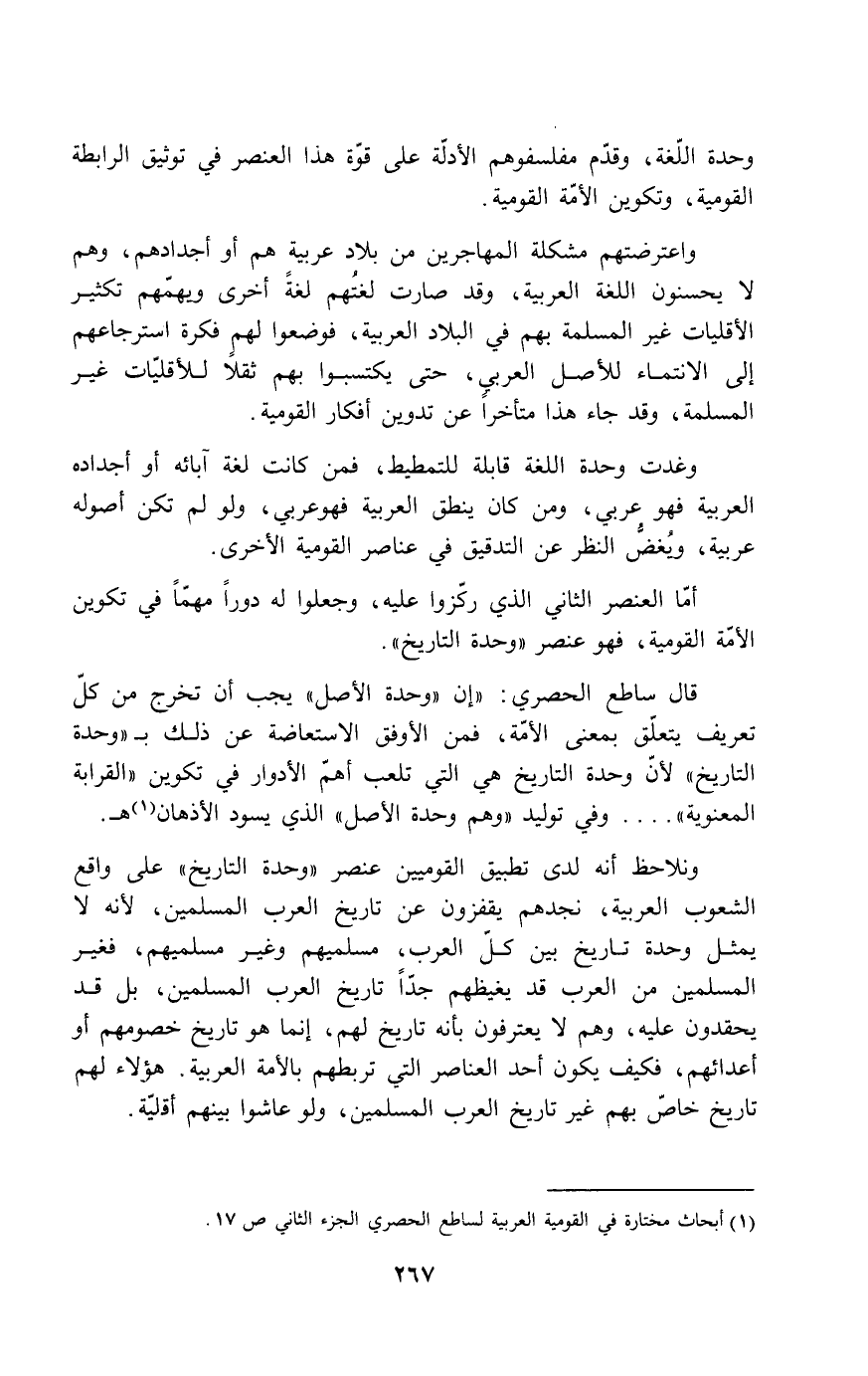 قال ساطع الحصري: إن "وحدة الأصل" يجب أن تخرج من كل تعريف يتعلق بمعنى الأمة، فمن الأوفق الاستعاضة عن ذلك بـ"وحدة التاريخ" لأن وحدة التاريخ هي التي تلعب أهم الأدوار في تكوين "القرابة المعنوية" ... وفي توليد "وهم وحدة الأصل" الذي يسود الأذهان هـ.