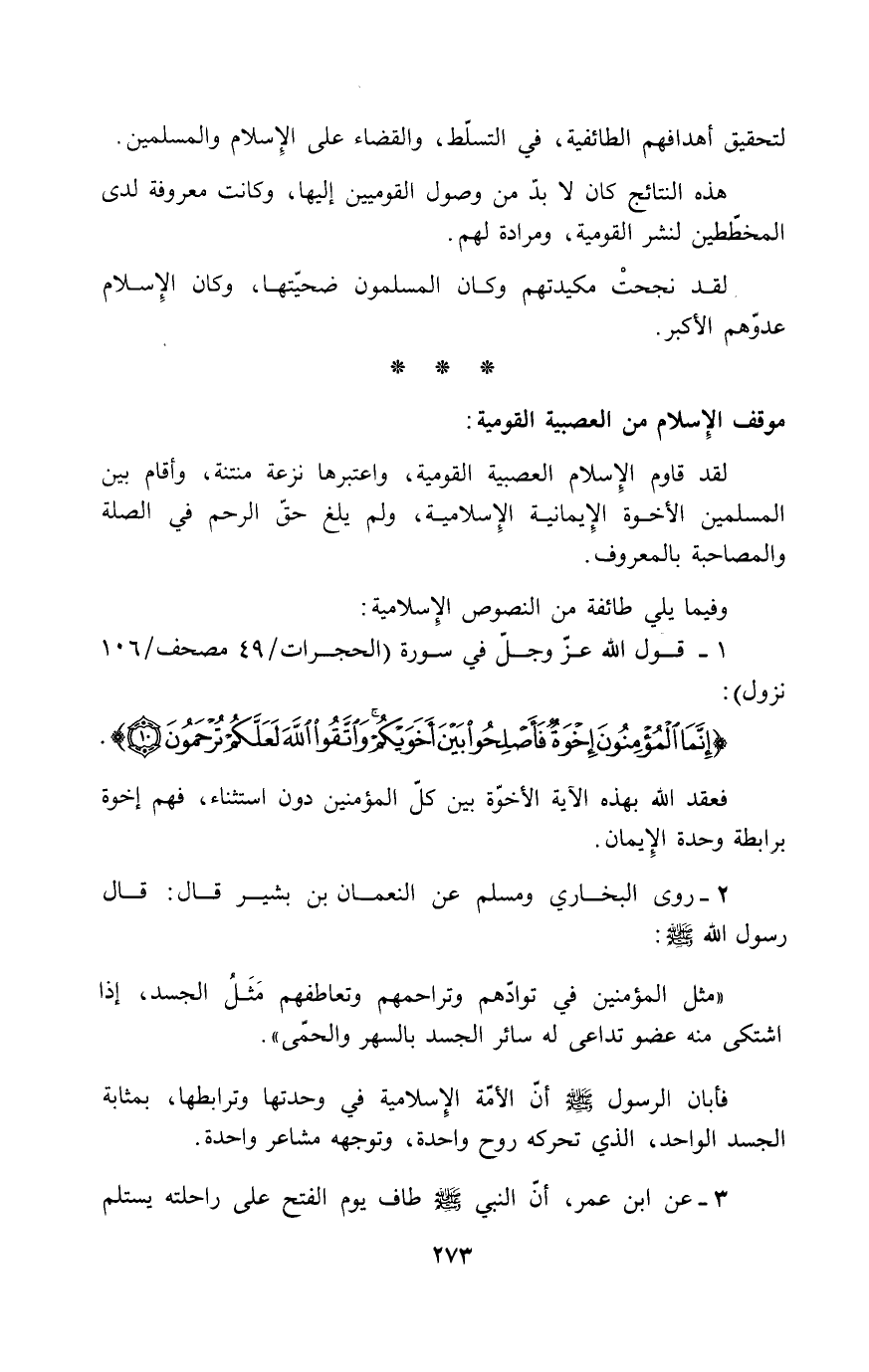 لقد قاوم الإسلام العصبية القومية، واعتبرها نزعة منتنة، وأقام بين المسلمين الأخوة الإيمانية الإسلامية، ولم يلغ حق الرحم في الصلة والمصاحبة بالمعروف.