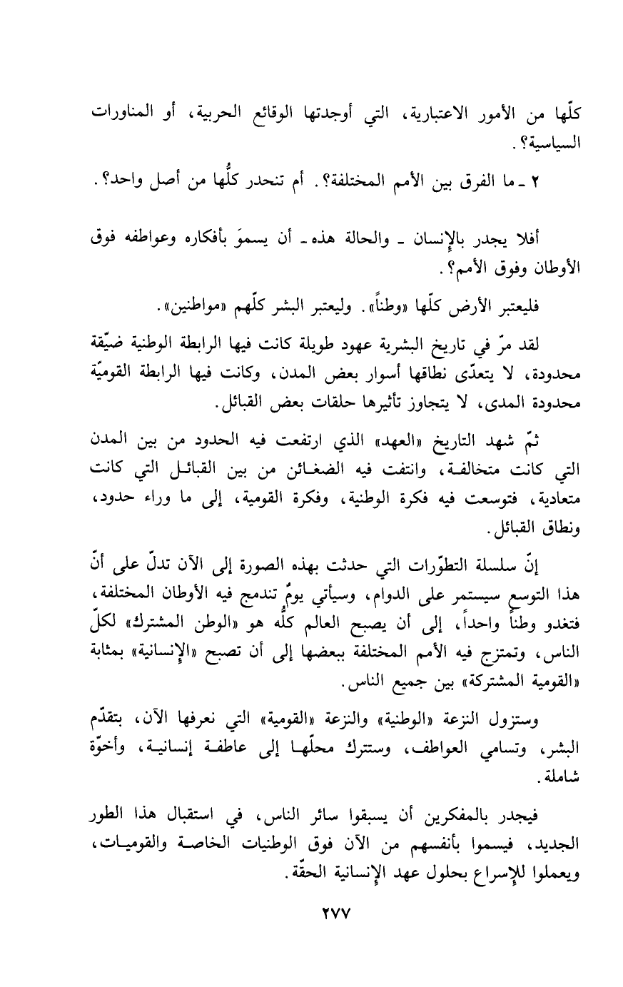 وستزول النزعة "الوطنية" والنزعة "القومية" التي نعرفها الآن، بتقدّم البشر، وتسامي العواطف، وستترك محلّها إلى عاطفة إنسانية، وأخوّة شاملة.