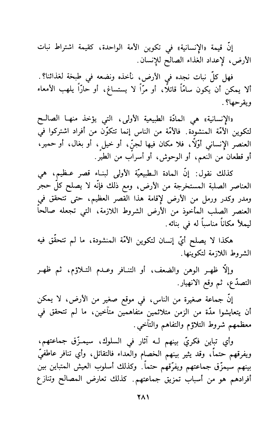 إن قيمة "الإنسانية" في تكوين الأمة الواحدة، كقيمة اشتراط نبات الأرض، لإعداد الغذاء الصالح للإنسان.
