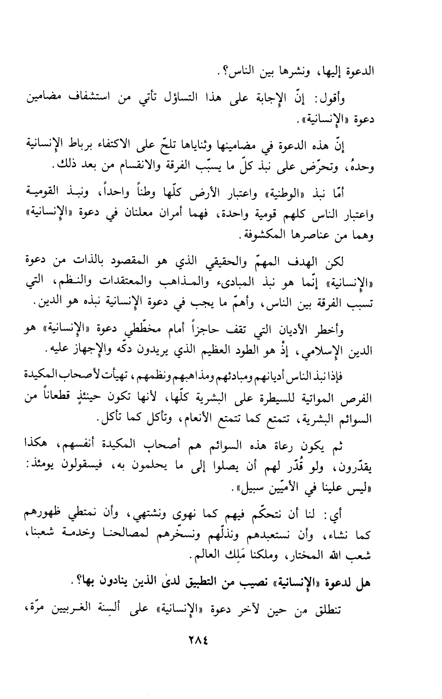إن هذه الدعوة في مضامينها وثناياها تلح على الاكتفاء برباط الإنسانية وحده، وتحرض على نبذ كل ما يسبب الفرقة والانقسام من بعد ذلك.