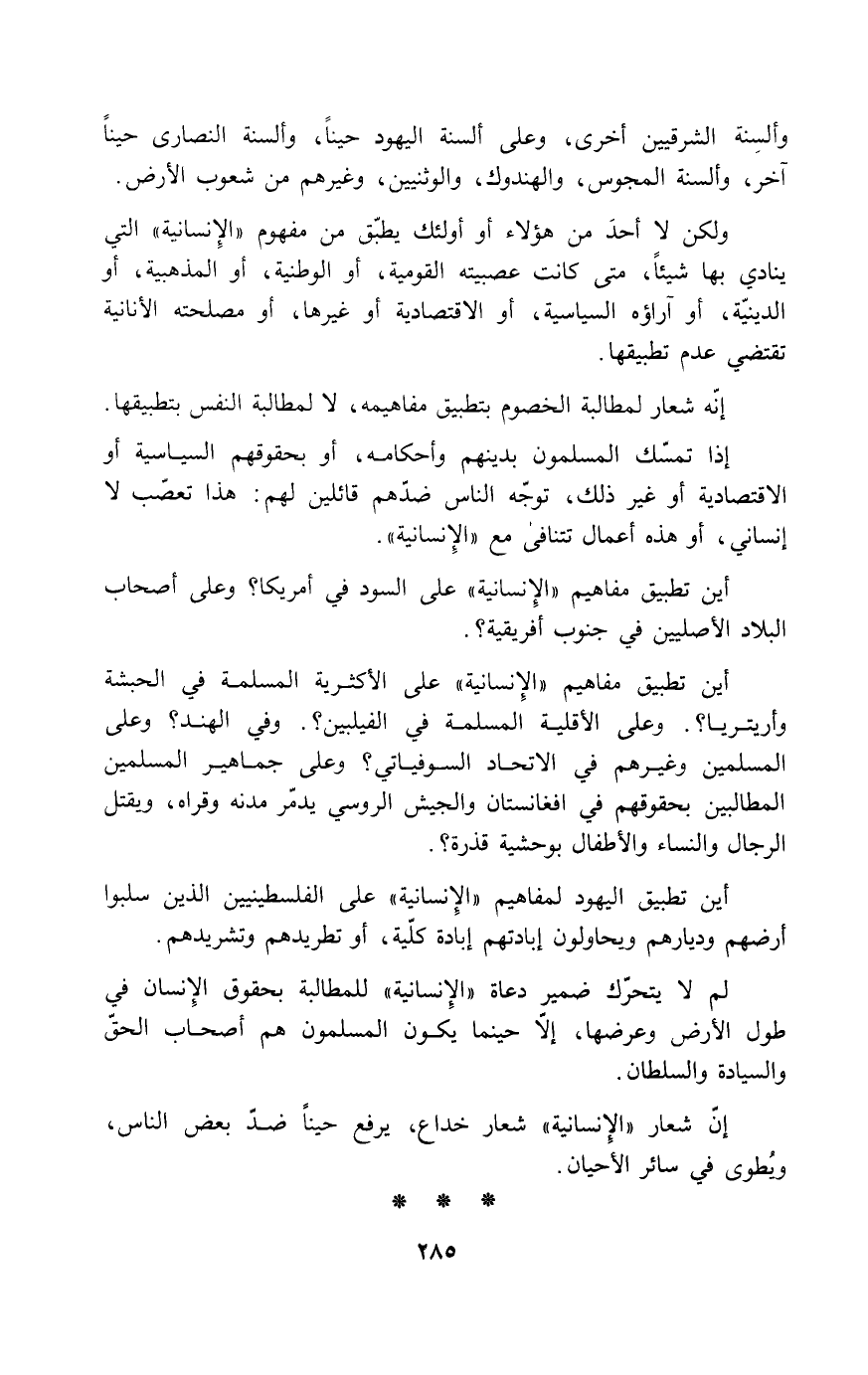 إذا تمسك المسلمون بدينهم وأحكامه، أو بحقوقهم السياسية أو الاقتصادية أو غير ذلك، توجّه الناس ضدهم قائلين لهم: هذا تعصّب لا إنساني، أو هذه أعمال تتنافى مع "الإنسانية".