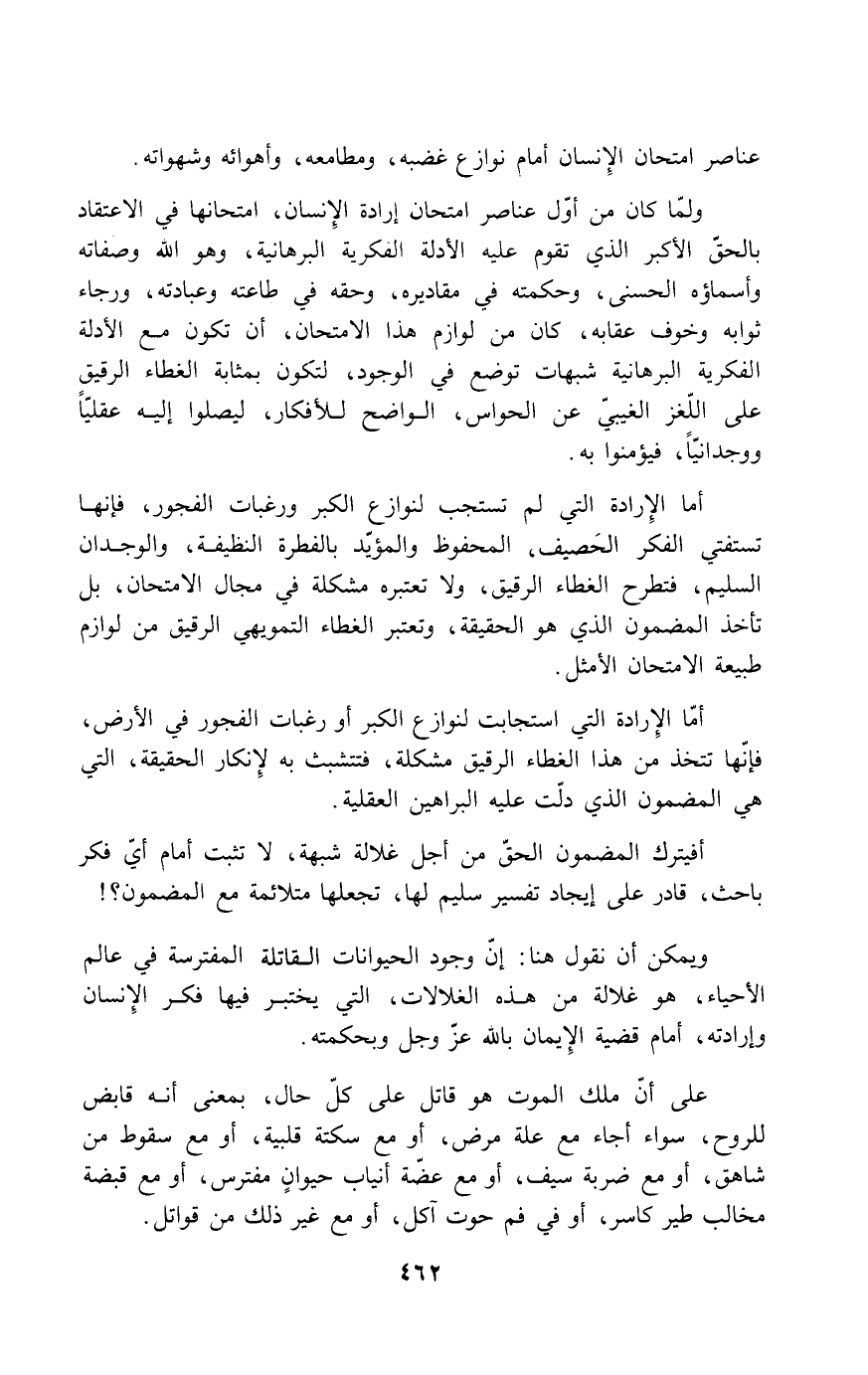 ولما كان من أول عناصر امتحان إرادة الإنسان، امتحانها في الاعتقاد بالحق الأكبر الذي تقوم عليه الأدلة الفكرية البرهانية، وهو الله وصفاته وأسماؤه الحسنى، وحكمته في مقاديره، وحقه في طاعته وعبادته، ورجاء ثوابه وخوف عقابه، كان من لوازم هذا الامتحان، أن تكون مع الأدلة الفكرية البرهانية شبهات توضع في الوجود، لتكون بمثابة الغطاء الرقيق على اللغز الغيبي عن الحواس، الواضح للأفكار، ليصلوا إليه عقلياً ووجدانايً، فيؤمنوا به.