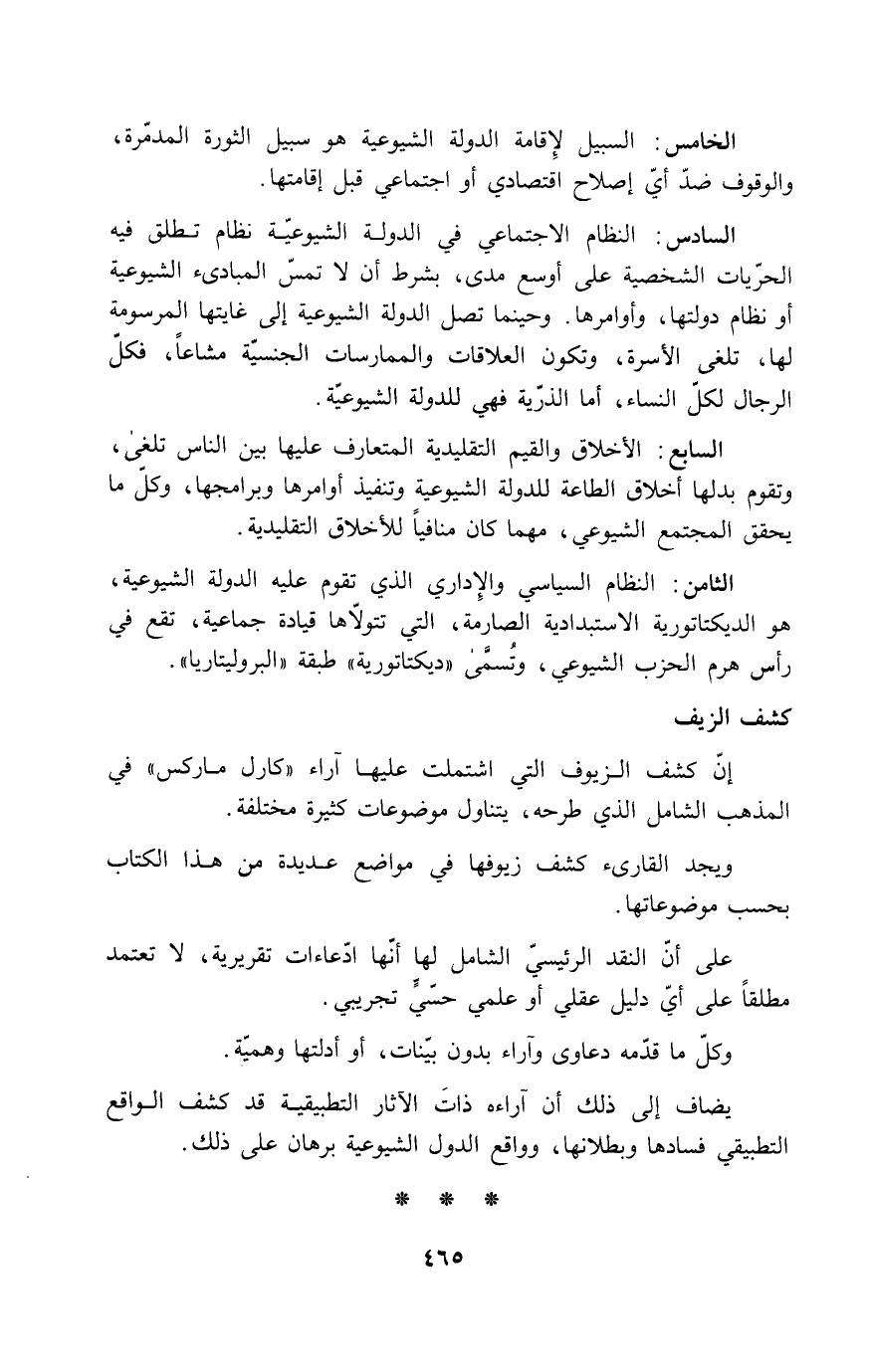 إنّ كشف الزيوف التي اشتملت عليها آراء "كارل ماركس" في المذهب الشامل الذي طرحه، يتناول موضوعات كثيرة مختلفة.