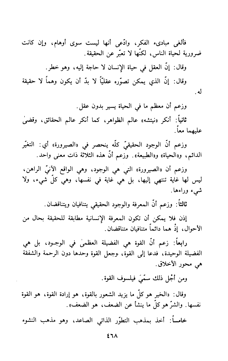 رابعاً: زعم أن القوة هي الفضيلة العظمى في الوجود، بل هي الفضيلة الوحيدة، فدعا إلى القوة، وجعل القوة وحدها دون الرحمة والشفقة هي محور الأخلاق.