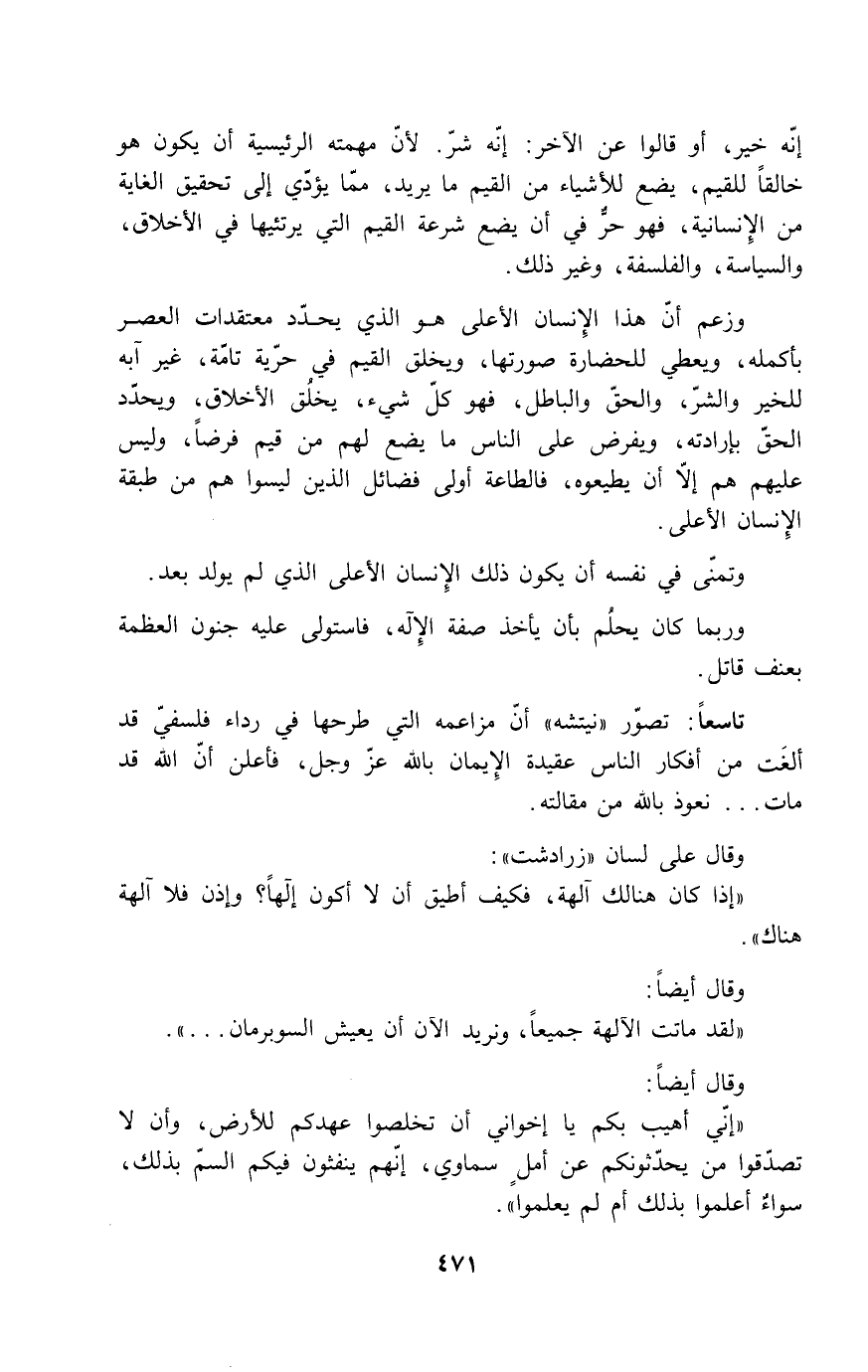 تاسعاً: تصور "نيتشه" أن مزاعمه التي طرحها في رداء فلسفي قد ألغت من أفكار الناس عقيدة الإيمان بالله عزّ وجلّ، فأعلن أن الله قد مات ... نعوذ بالله من مقالته.