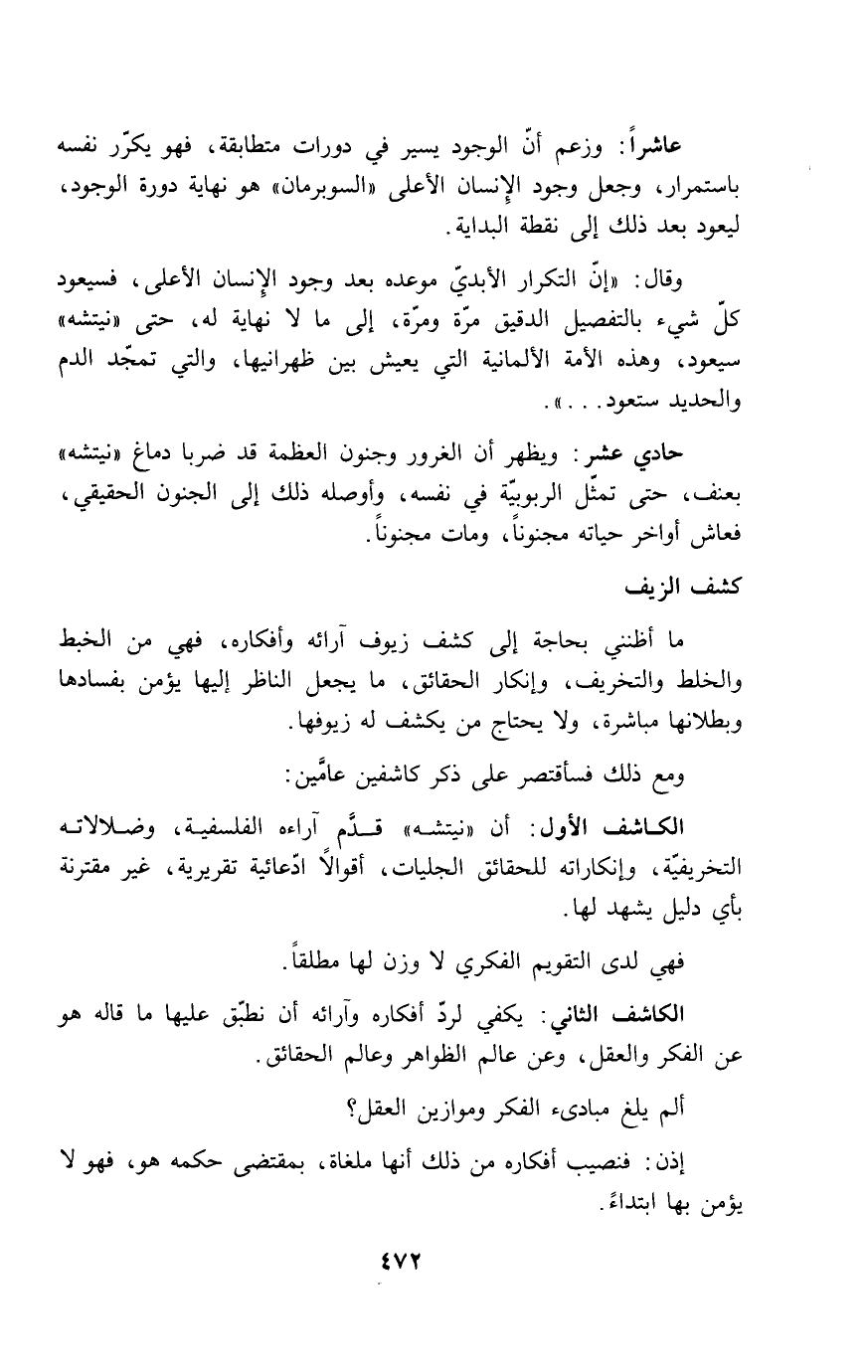 عاشراً: وزعم أن الوجود يسير في دورات متطابقة، فهو يكرّر نفسه باستمرار، وجعل وجود الإنسان الأعلى "السوبرمان" هو نهاية دورة الوجود، ليعود بعد ذلك إلى نقطة البداية.