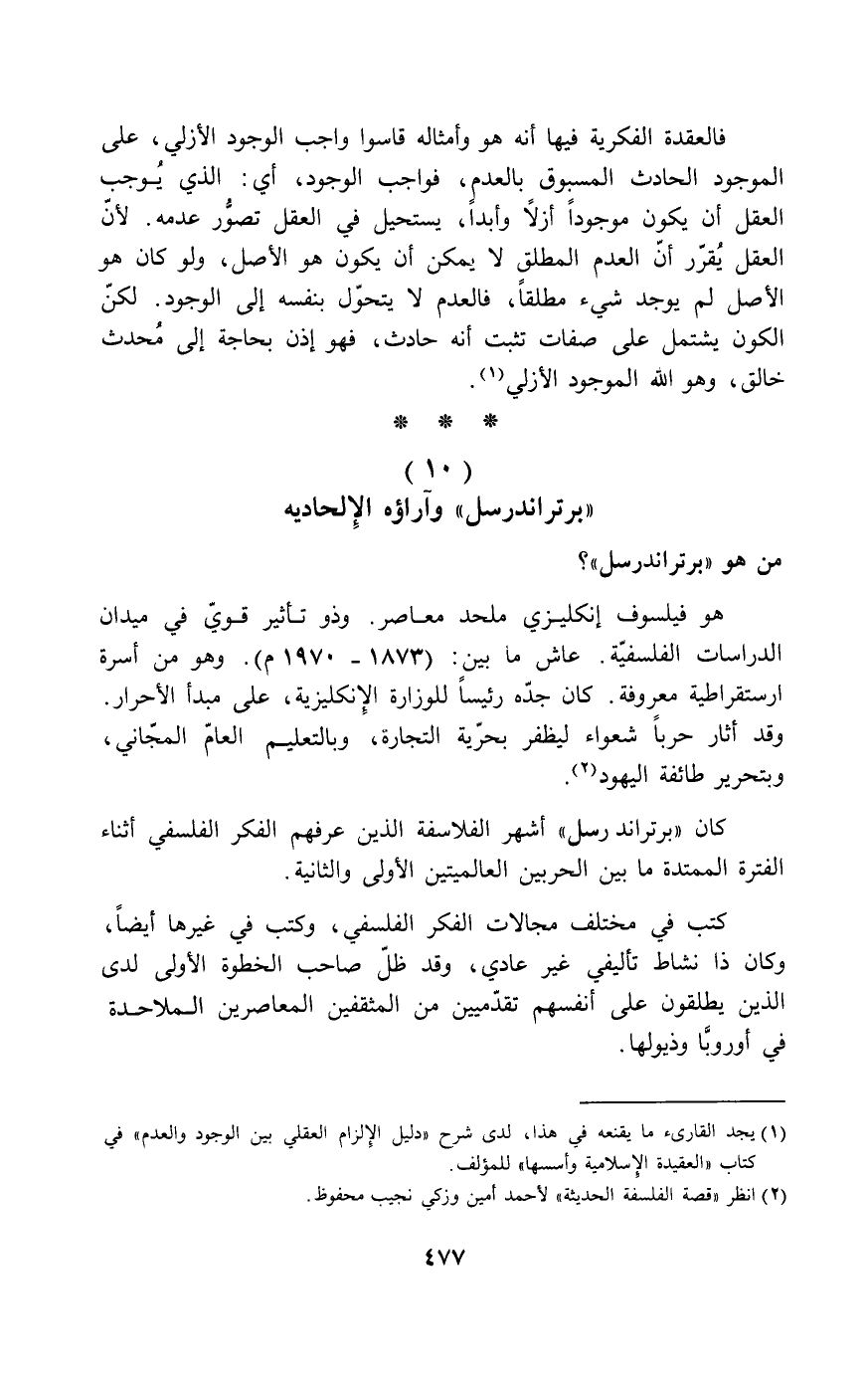 فالعقدة الفكرية فيها أنه هو وأمثاله قاسوا واجب الوجود الأزلي، على الموجد الحادث المسبوق بالعدم، فواجب الوجود، أي: الذي يوجب العقل أن يكون موجوداً أزلاً وأبداً، يستحيل في العقل تصور عدمه. لأن العقل يقرر أن العدم المطلق لا يمكن أن يكون هو الأصل، ولو كان هو الأصل لم يوجد شيء مطلقاً، فالعدم لا يتحول بنفسه إلى الوجود. لكن الكون يشتمل على صفات تثبت أنه حادث، فهو إذن بحاجة إلى مُحدث خالق، وهو الله الموجود الأزلي.