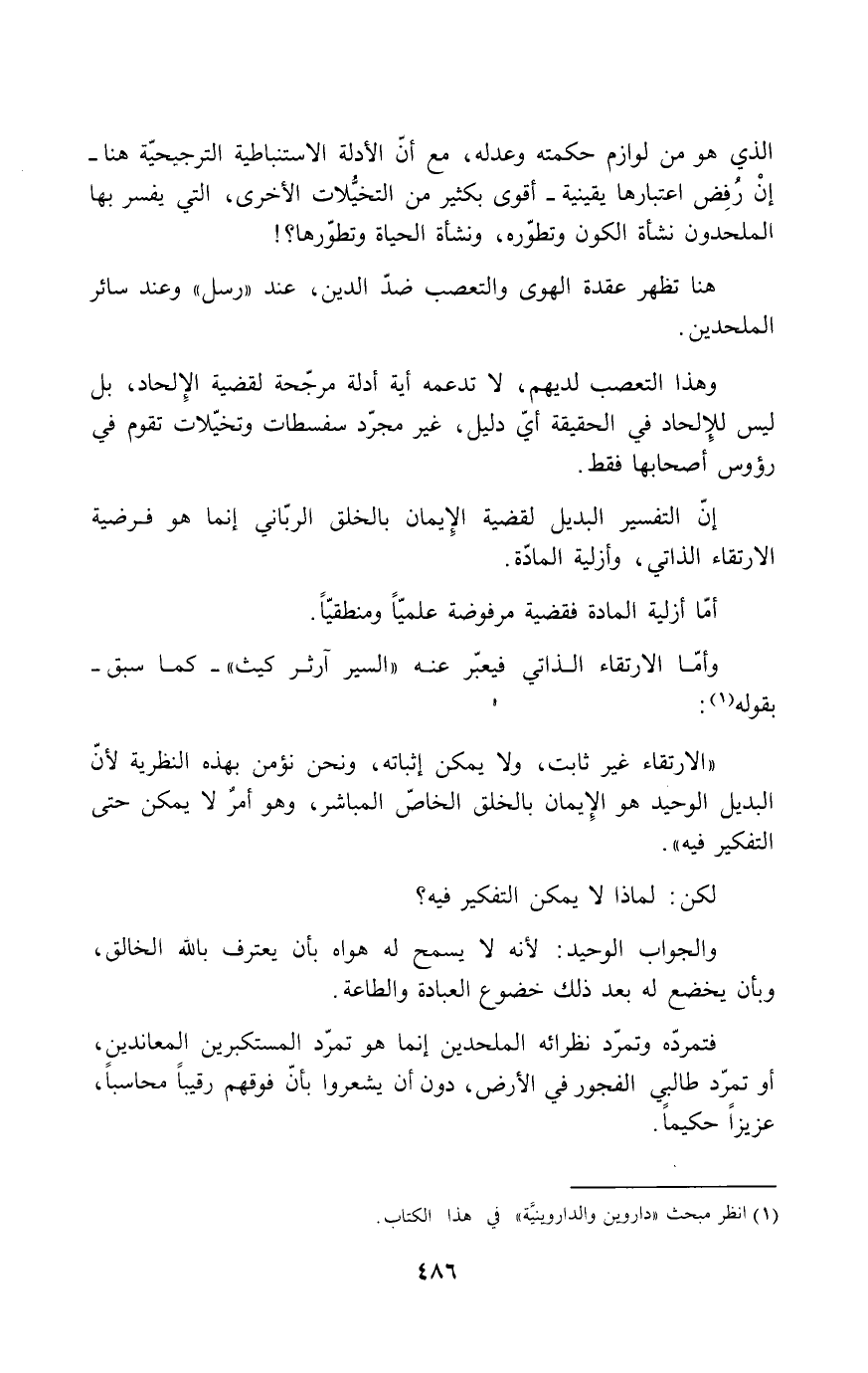 الذي هو من لوازم حكمته وعدله، مع أن الأدلة الاستنباطية الترجيحية هنا - إن رُفِض اعتبارها يقينية- أقوى بكثير من التخيلات الأخرى، التي يفسر بها الملحدون نشأة الكون وتطوره، ونشأة الحياة وتطورها؟!