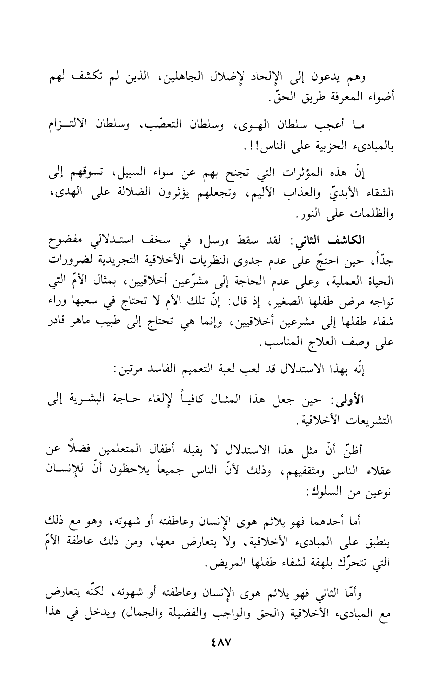 الكاشف الثاني: لقد سقط "رسل" في سخف استدلالي مفضوح جداً، حين احتج على عدم جدوى النظريات الأخلاقية التجريدية لضرورات الحياة العملية، على عدم الحاجة إلى مشرعين أخلاقيين، بمثال الأم التي تواجه مرض طفلها الصغير، إذ قال: إن تلك الأم لا تحتاج في سعيها وراء شفاء طفلها إلى مشرعين أخلاقيين، وإنما هي تحتاج إلى طبيب ماهر قادر على وصف العلاج المناسب.