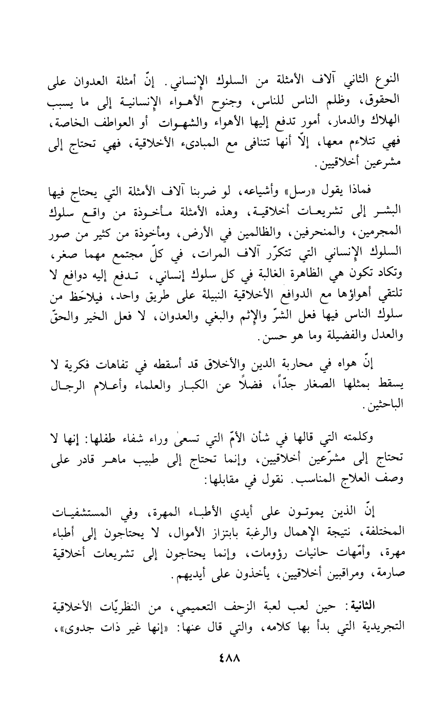 فماذا يقول "رسل" وأشياعه، لو ضربنا آلاف الأمثلة التي يحتاج فيها البشر إلى تشريعات أخلاقية، وهذه الأمثلة مأخوذة من واقع سلوك المجرمين، والمنحرفين، والظالمين في الأرض، ومأخوذة من كثر من صور السلوك الإنساني التي تتكرر آلاف المرات، في كل مجتمع مهما صغر، وتكاد تكون هي الظاهرة الغالبة في كل سلوك إنساني، تدفع إليه دوافع لا تلتقي أهواؤها مع الدوافع الأخلاقية النبيلة على طريق واحد، فيلاحَظ من سلوك الناس فيها فعل الشرّ والإثم والبغي والعدوان، لا فعل الخير والحق والعدل والفيلة وما هو حسن.