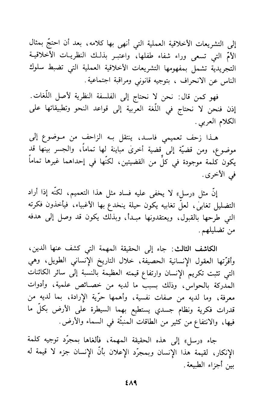 فهو كمن قال: نحن لا نحتاج إلى الفلسفة النظرية لأصل اللغات. إذن فنحن لا نحتاج في اللغة العربية إلى قواعد النحو وتطبيقاتها على الكلام العربي.