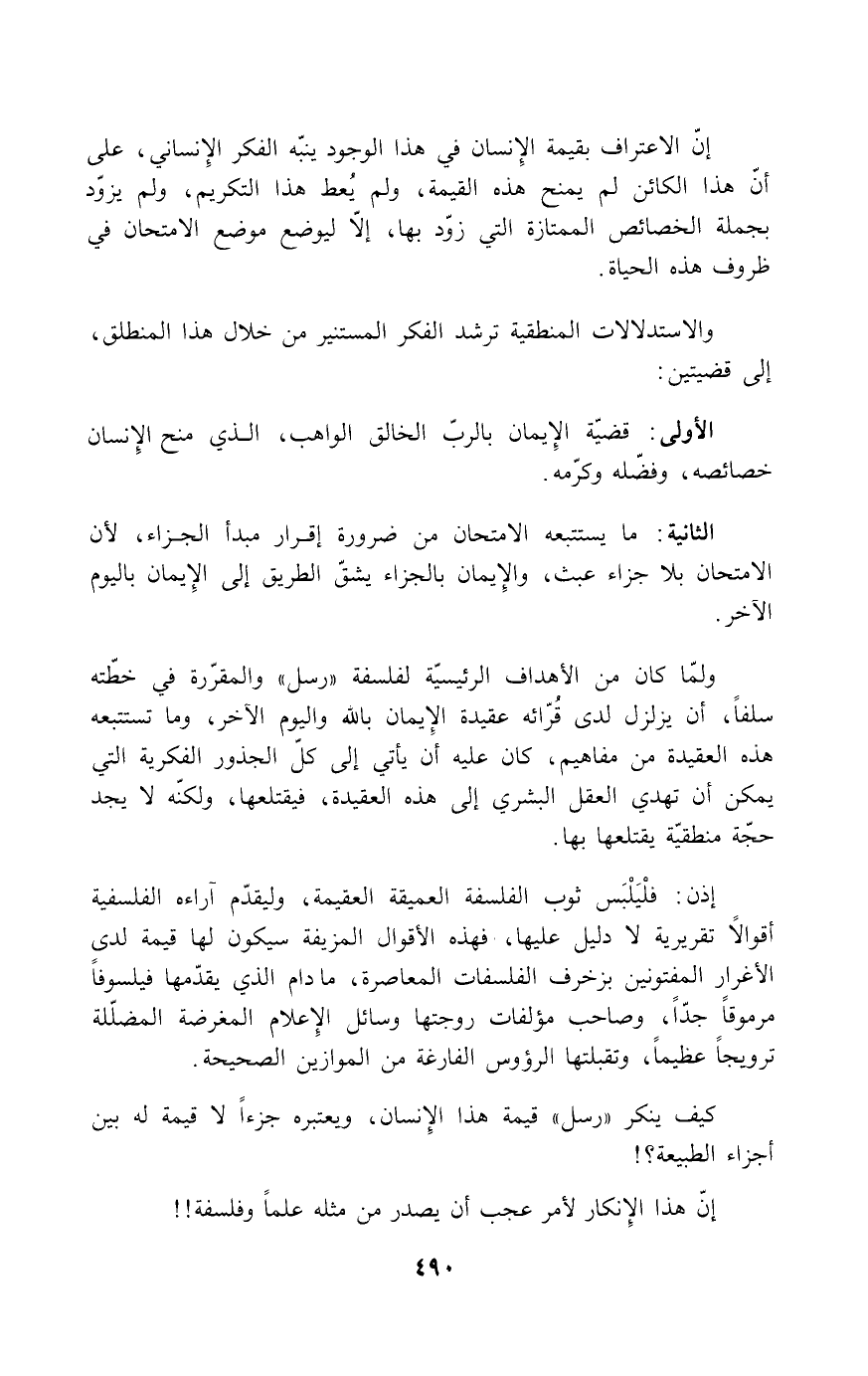 إذن: فلْيَلْبَس ثوب الفلسفة العميقة العقيمة، وليقدم آراءه الفلسفية أقوالاً تقريرية لا دليل عليها، فهذه الأقوال المزيفة سيكون لها قيمة لدى الأغرار المفتونين بزخرف الفلسفات المعاصرة، ما دام الذي يقدمها فيلسوفاً مرموقاً جداً، وصاحب مؤلفات روجتها وسائل الإعلام المغرضة المضللة ترويجاً عظيماً، وتقبّلتها الرؤوس الفارغة من الموازين الصحيحة.