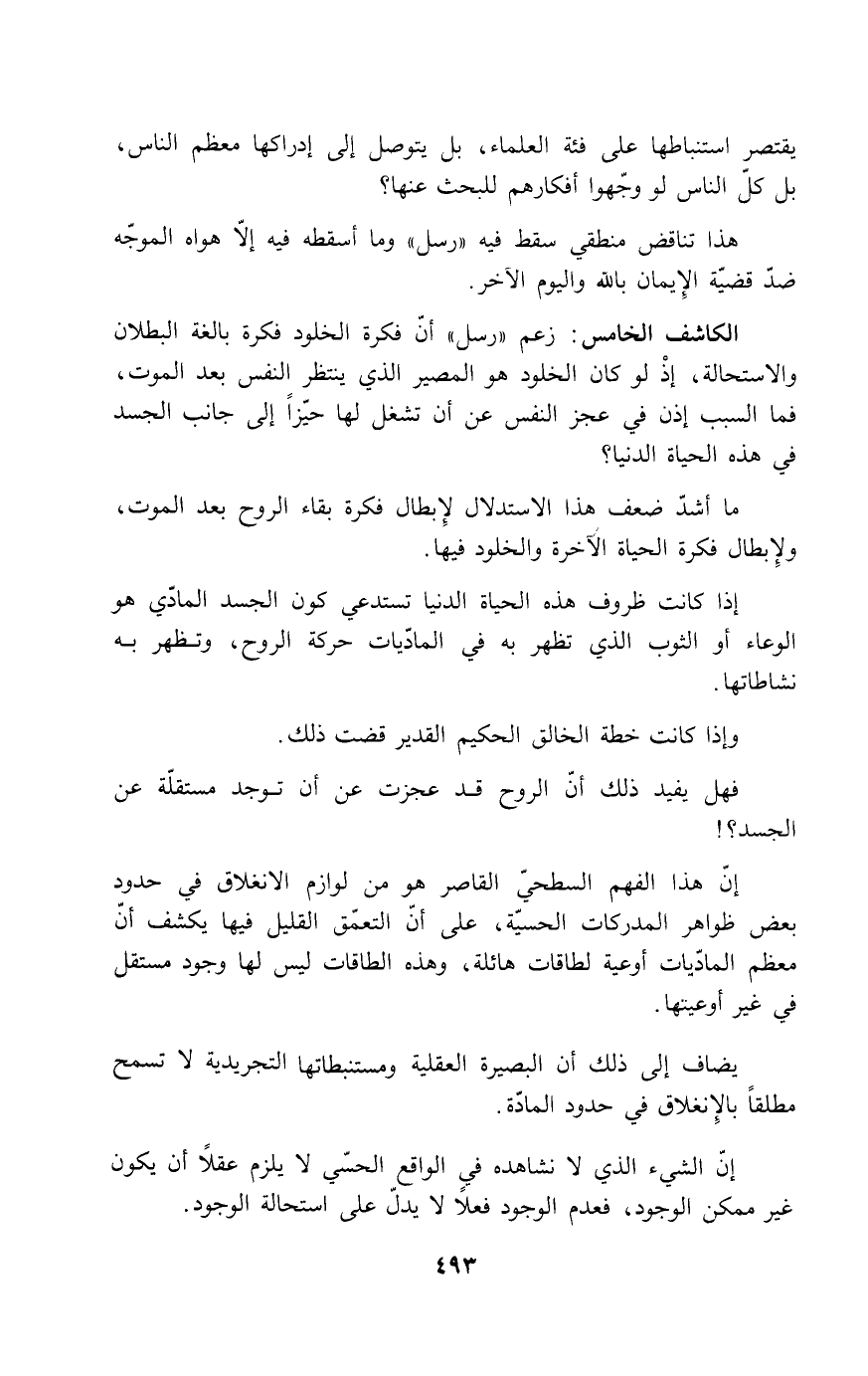 الكاشف الخامس: زعم "رسل" أن فكرة الخلود فكرة بالغة البطلان والاستحالة، إذ لو كان الخلود هو المصير الذي ينتصر النفس بعد الموت، فما السبب إذن في عجز النفس عن أن تشغل لها حيزاً إلى جانب الجسد في هذه الحياة الدنيا؟