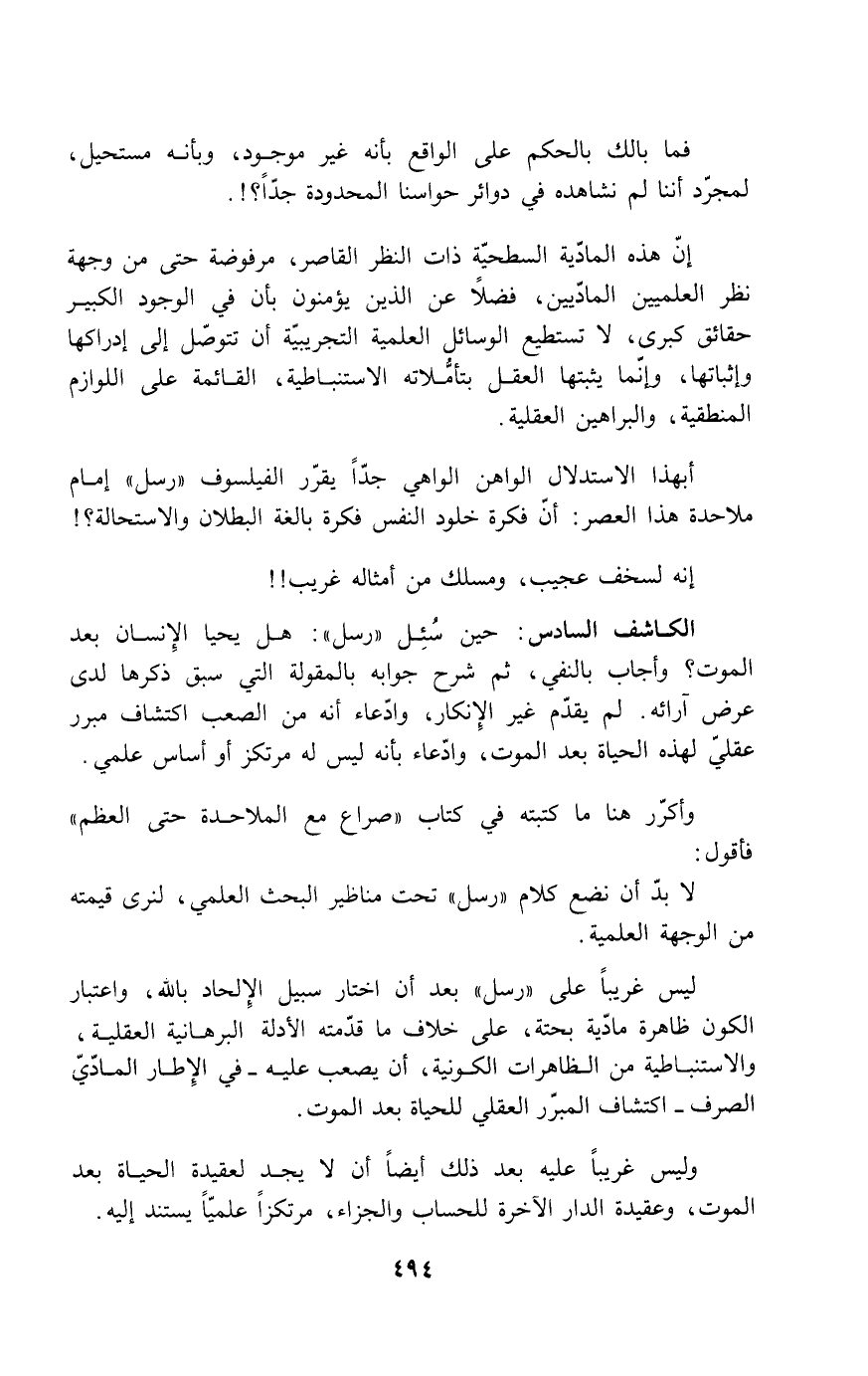 أبهذا الاستدلال الواهن الواهي جداً يقرر الفيلسوف "رسل" إمام ملاحدة هذا العصر: أن فكرة خلود النفس فكرة بالغة البطلان والاستحالة؟!