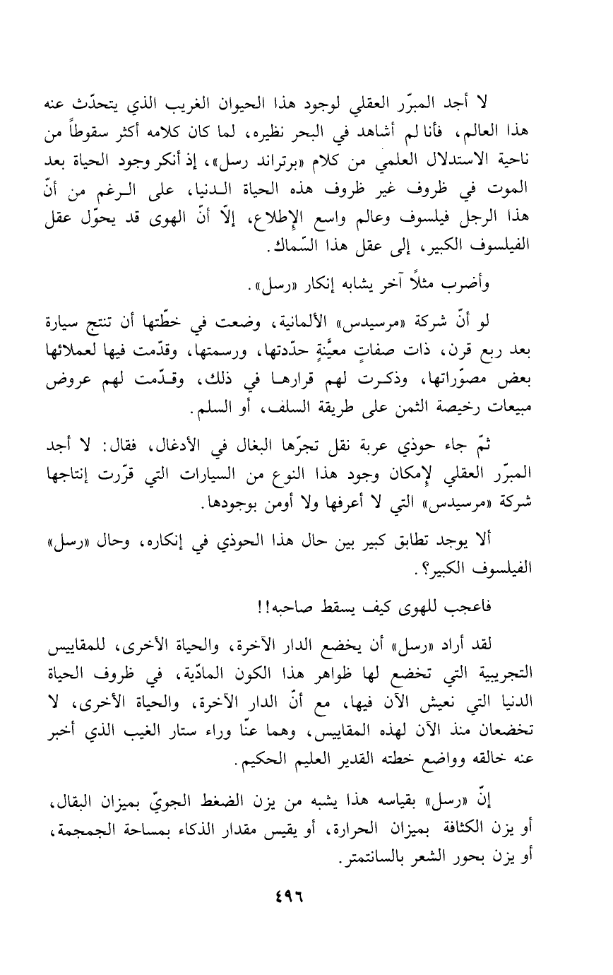لا أجد المبرر العقلي لوجود هذا الحيوان الغريب الذي يتحدث عنه هذا العالم، فأنا لم أشاهد في البحر نظيره، لما كان كلامه أكثر سقوطاً من ناحية الاستدلال العلمي من كلام "برتراند رسل"، إذ أنكر وجود الحياة بعد الموت في ظروف غير ظروف هذه الحياة الدنيا، على الرغم من أن هذا الرجل فيلسوف وعالم واسع الاطلاع، إلا أن الهوى قد يحوّل العقل الفيلسوف الكبير، إلى عقل هذا السماك.