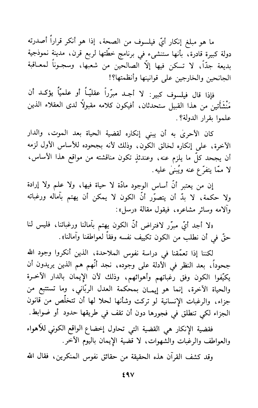 فقضية الإنكار هي القضية التي تحاول إخضاع الواقع الكوني للأهواء والعواطف والرغبات والشهوات، لا قضية الإيمان باليوم الآخر.