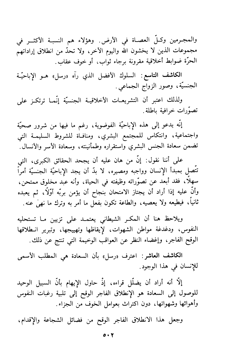 إلا أنه أراد أن يضلل قراءه، إذ حاول الإيهام بأن السبيل الوحيد للوصول إلى السعادة هو الانطلاق الفاجر الوقح إلى تلبية رغبات النفوس وأهوائها وشهواتها، دون اكتراث بعوامل الخوف من الجزاء.