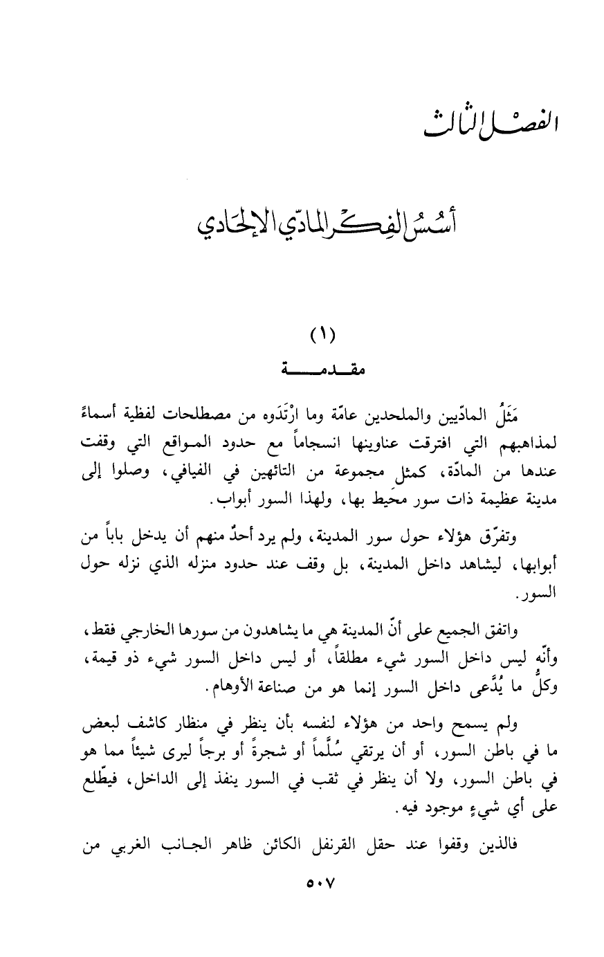 مَثَلُ المادّيين والملحدين عامّة وما ارْتَدَوه من مصطلحات لفظية أسماءً لمذاهبهم التي افترقت عناوينها انسجاماً مع حدود المواقع التي وقفت عندها من المادة، كمثل مجموعة من التائهين في الفيافي، وصلوا إلى مدينة عظيمة ذات سور محيط بها، ولهذا السور أبواب.