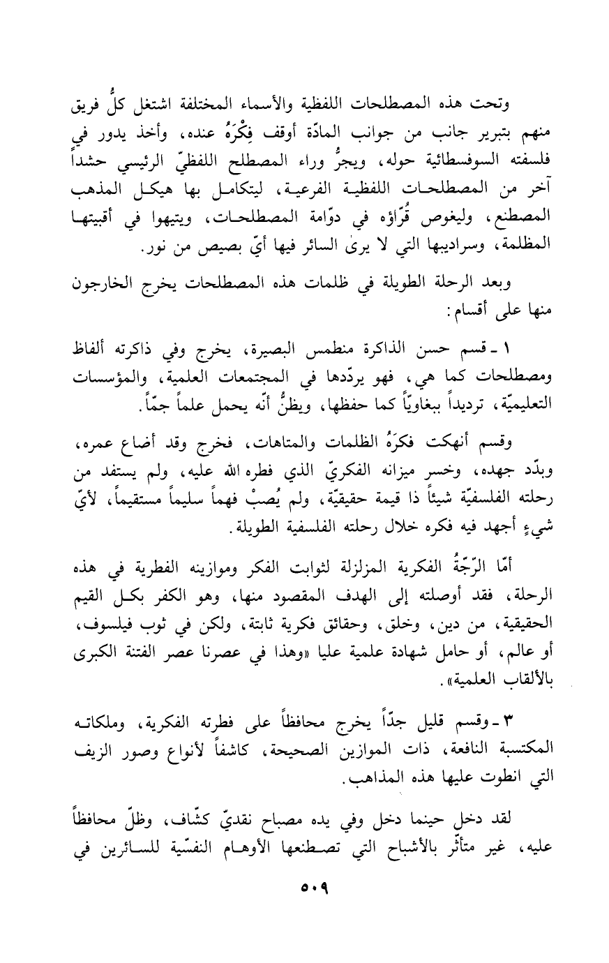 2- وقسم أنهكت فكره الظلمات والمتاهات، فخرج وقد أضاع عمره، وبدد جهده، وخسر ميزانه الفكري الذي فطره الله عليه، ولم يستفد من رحلته الفلسفية شيئاً ذا قيمة حقيقية، ولم يصب فهماً سليما مستقيماً، لأي شيء أجهد فيه فكره خلال رحلته الفلسفية الطويلة.