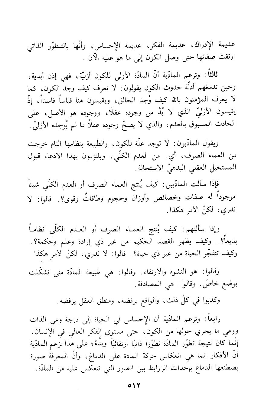 وإذا سألتهم: كيف يُنتج العماء الصرف أو العدم الكلي نظاماً بديعاً؟ . وكيف يظهر القصد الحكيم من غير ذي إرادة وعلم وحكمة؟. وكيف تتفجر الحياة من غير ذي حياة؟ . قالوا: لا ندري، لكن الأمر هكذا.