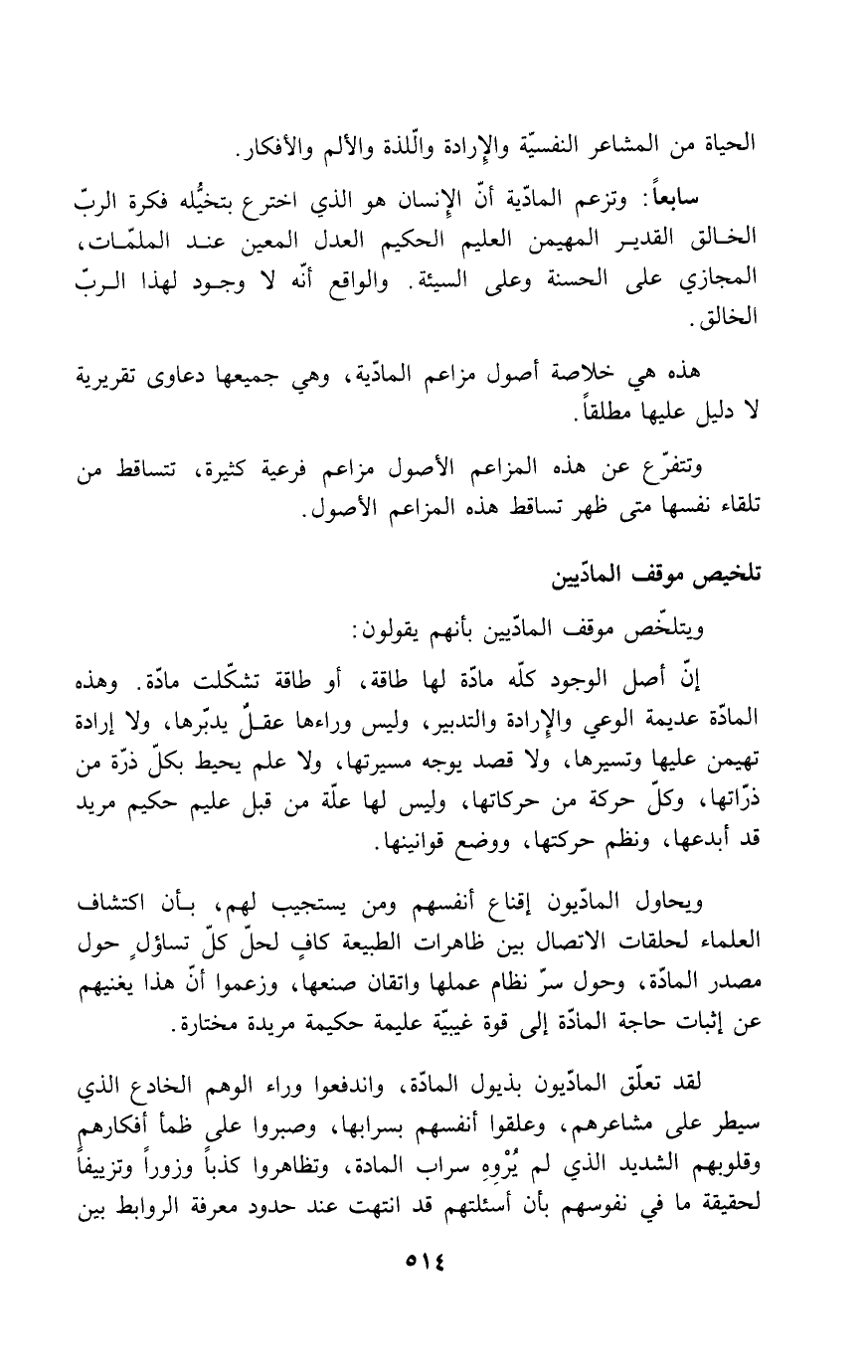 لقد تعلق الماديون بذيول المادة، واندفعوا وراء الوهم الخادع الذي سيطر على مشاعرهم، وعلقوا أنفسهم بسرابها، وصبروا على ظمأ أفكارهم وقلوبهم الشديد الذي لم يُرْوِهِ سراب المادة، وتظاهروا كذباً وزوراً وتزييفاً لحقيقة ما في نفوسهم بأن أسئلتهم قد انتهت عند حدود معرفة الروابط بين