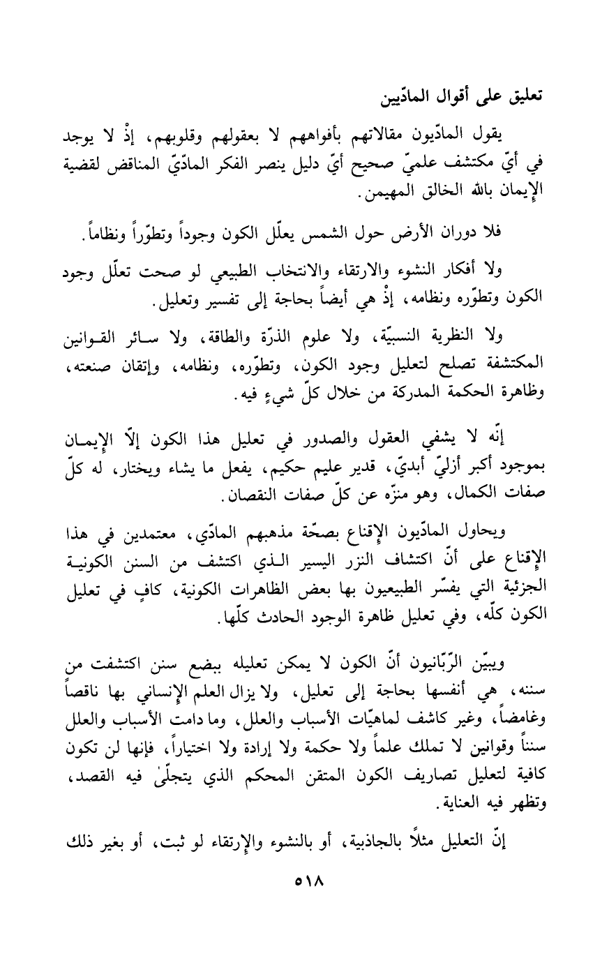 ولا النظرية النسبي، ولا علوم الذرة والطاقة، ولا سائر القوانين المكتشفة تصلح لتعليل وجود الكون، وتطوره، ونظامه، وإتقان صنعته، وظاهرة الحكمة المدركة من خلال كل شيءٍ فيه.