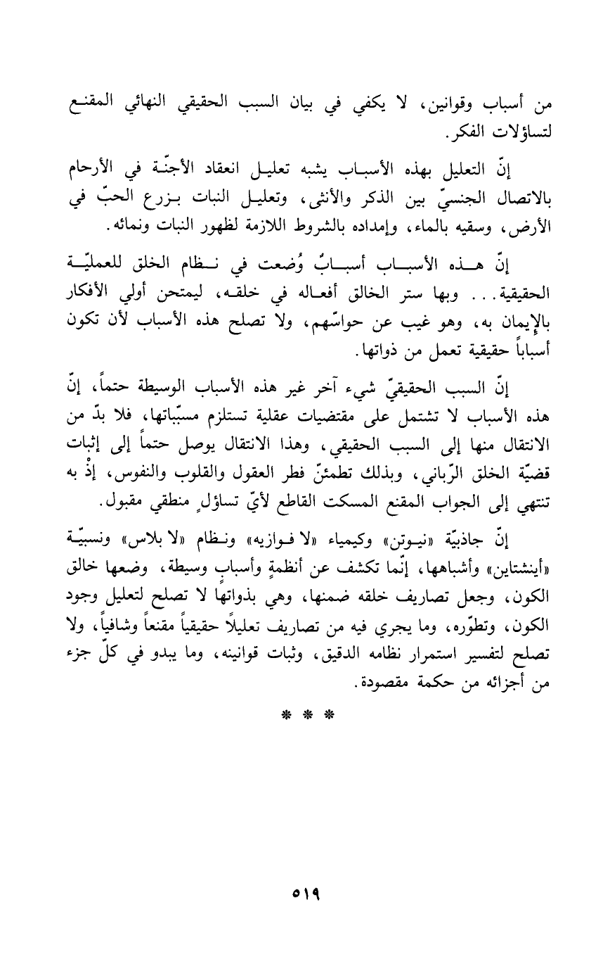 إن جاذبية "نيوتن" وكيمياء "لافوازيه" ونظام "لا بلاس" ونسبية "آينشتاين" وأشباهها، إنما تكشف عن أنظمةٍ وأسباب وسيطة، وضعها خالق الكون، وجعل تصاريف خلقه ضمنها، وهي بذواتها لا تصلح لتعليل وجود الكون، وتطوره، وما يجري فيه من تصاريف تعليلاً حقيقياً مقنعاً وشافياً، ولا تصلح لتفسير استمرار نظامه الدقيق، وثبات قوانينه، وما يبدو في كل جزء من أجزائه من حكمة مقصودة.