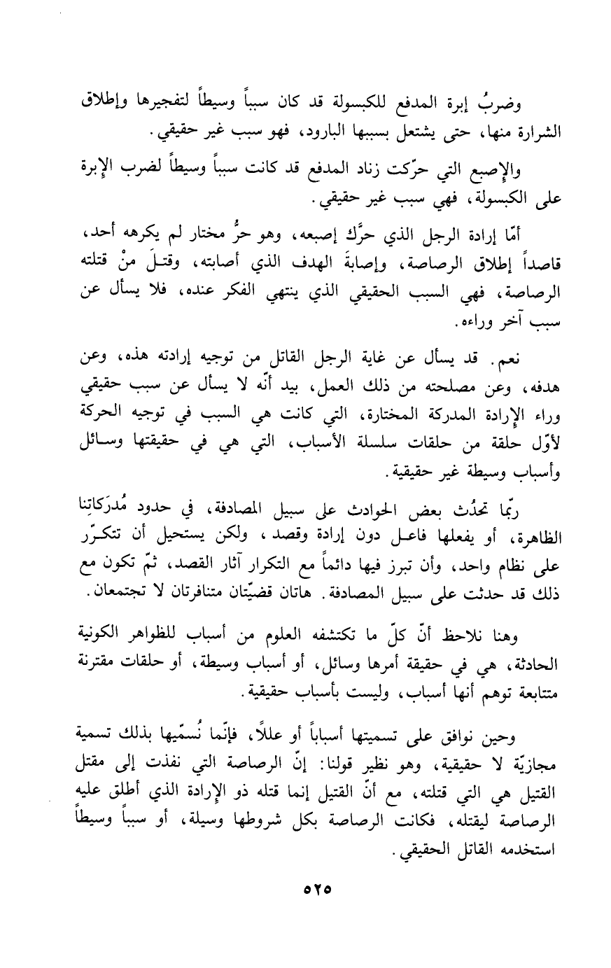 أما إرادة الرجل الذي حرَّك إصبعه، وهو حرٌ مختار لم يكرهه أحد، قاصداً إطلاق الرصاصة، وإصابةَ الهدف الذي أصابته، وقتلَ من قتلته الرصاصة، فهي السبب الحقيقي الذي ينتهي الفكر عنده، فلا يسأل عن سبب آخر وراءه.