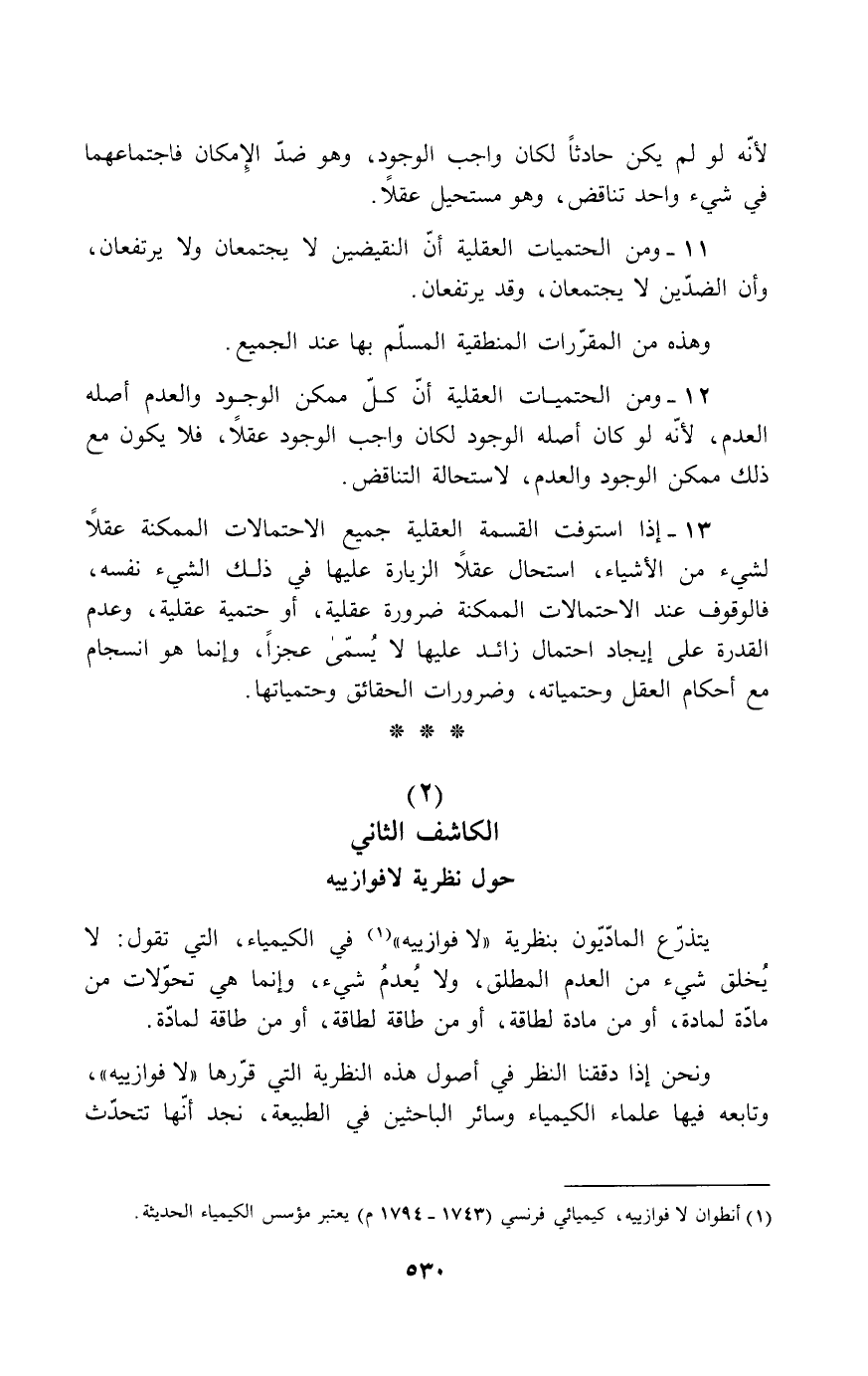ونحن إذا دققنا في أصول هذه النظرية التي قرّرها "لافوازييه"، وتابعه فيها علماء الكيمياء وسائر الباحثين في الطبيعة، نجد أنها تتحدث