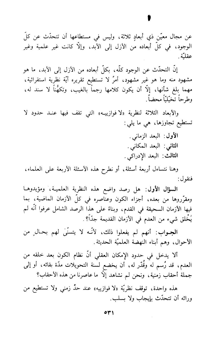 عن مجال معيّنٍ ذي أبعادٍ ثلاثة، وليس في مستطاعها أن تتحدث عن كل الوجود، في كل أبعاده من الأزل إلى الأبد، وإلا كانت غير علمية وغير عقلية.
