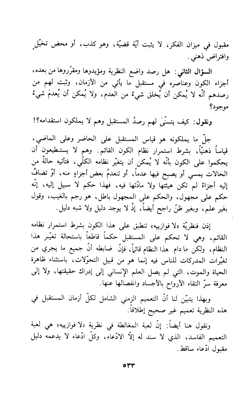 جل ما يملكونه هو قياس المستقبل على الحاضر وعلى الماضي، قياساً ذهنياً، بشرط استمرار نظام الكون القائم. وهم لا يستطيعون أن يحكموا على الكون بأنه لا يمكن أن يتغير نظامه الكلي، فتأتيه حالةٌ من الحالات يمسي أو يصبح فيها عدماً، أو تنعدمُ بعض أجزاءٍ منه، أو تضافُ غليه أجزاءٌ لم تكن هيئتها ولا مادتها فيه، فهذا حكم لا سبيل إليه، إنه حكم على مجهول، والحكم على المجهول باطل، هو رجم بالغيب، وقول بغير علم، وبغير ظن راجح أيضاً، إذ لا يوجد دليل ولا شبه دليل.