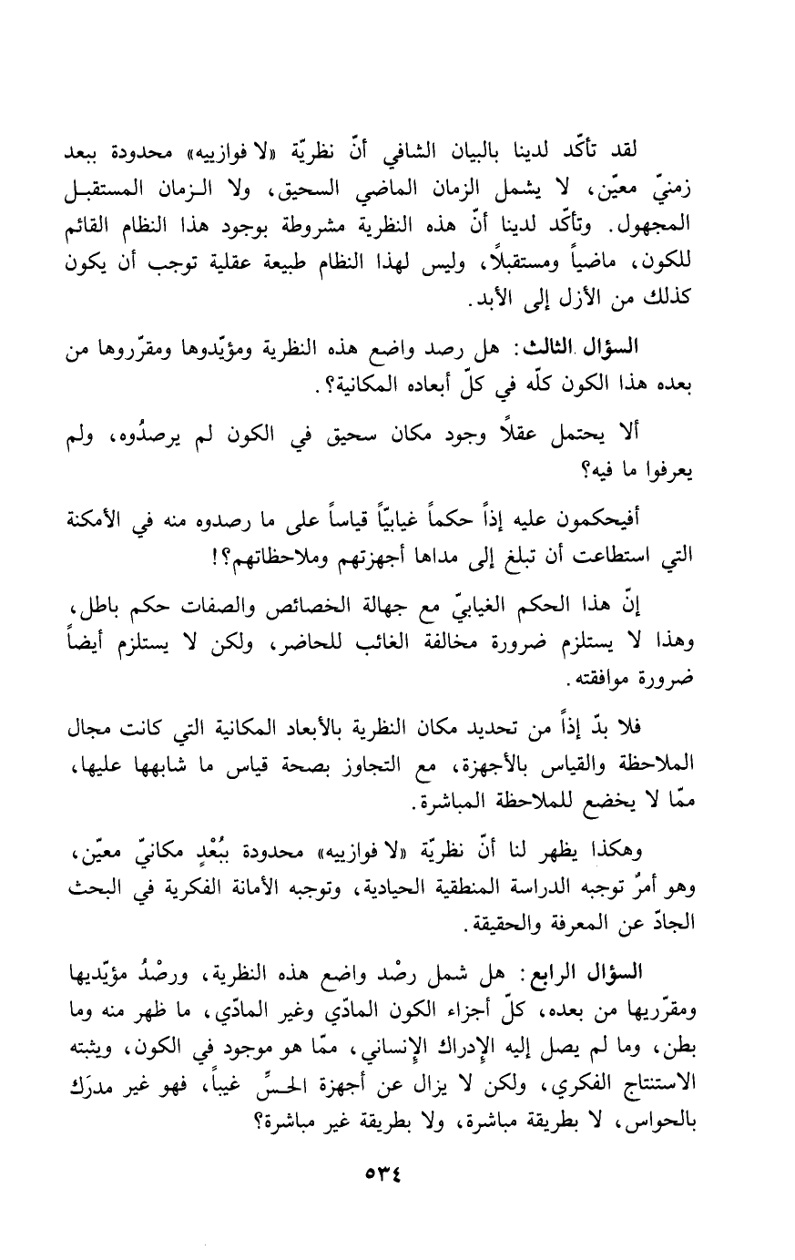 السؤال الرابع: هل شمل رصْد واضع هذه النظرية، ورصدُ مؤيّديها ومقرّريها من بعده، كل أجزاء الكون المادي وغير المادّي، ما ظهر منه وما بطن، وما لم يصل إليه الإدراك الإنساني، مما هو موجود في الكون، ويثبته الاستنتاج الفكري، ولكن لا يزال عن أجهزة الحس غيباً، فهو غير مدرك بالحواس، لا بطريقة مباشرة، ولا بطريقة غير مباشرة؟