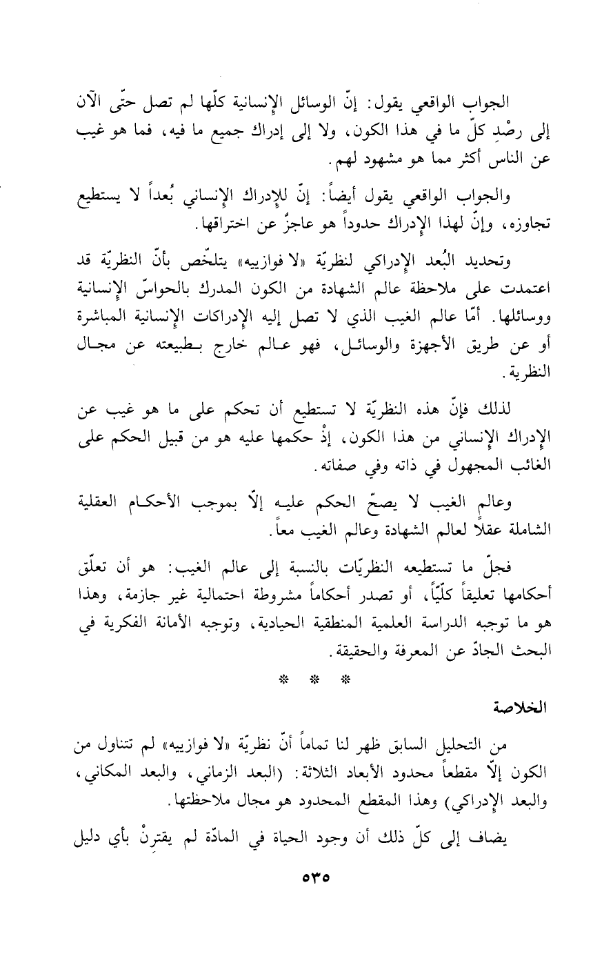 فجلّ ما تستطيعه النظريّات بالنسبة إلى عالم الغيب: هو أن تعلّق أحكامها تعليقاً كليّاً، أو تصدر أحكاماً مشروطة احتمالية غير جازمة، وهذا هو ما توجبه الدراسة العلمية المنطقية الحيادية، وتوجبه الأمانة الفكرية في البحث الجاد عن المعرفة والحقيقة.
