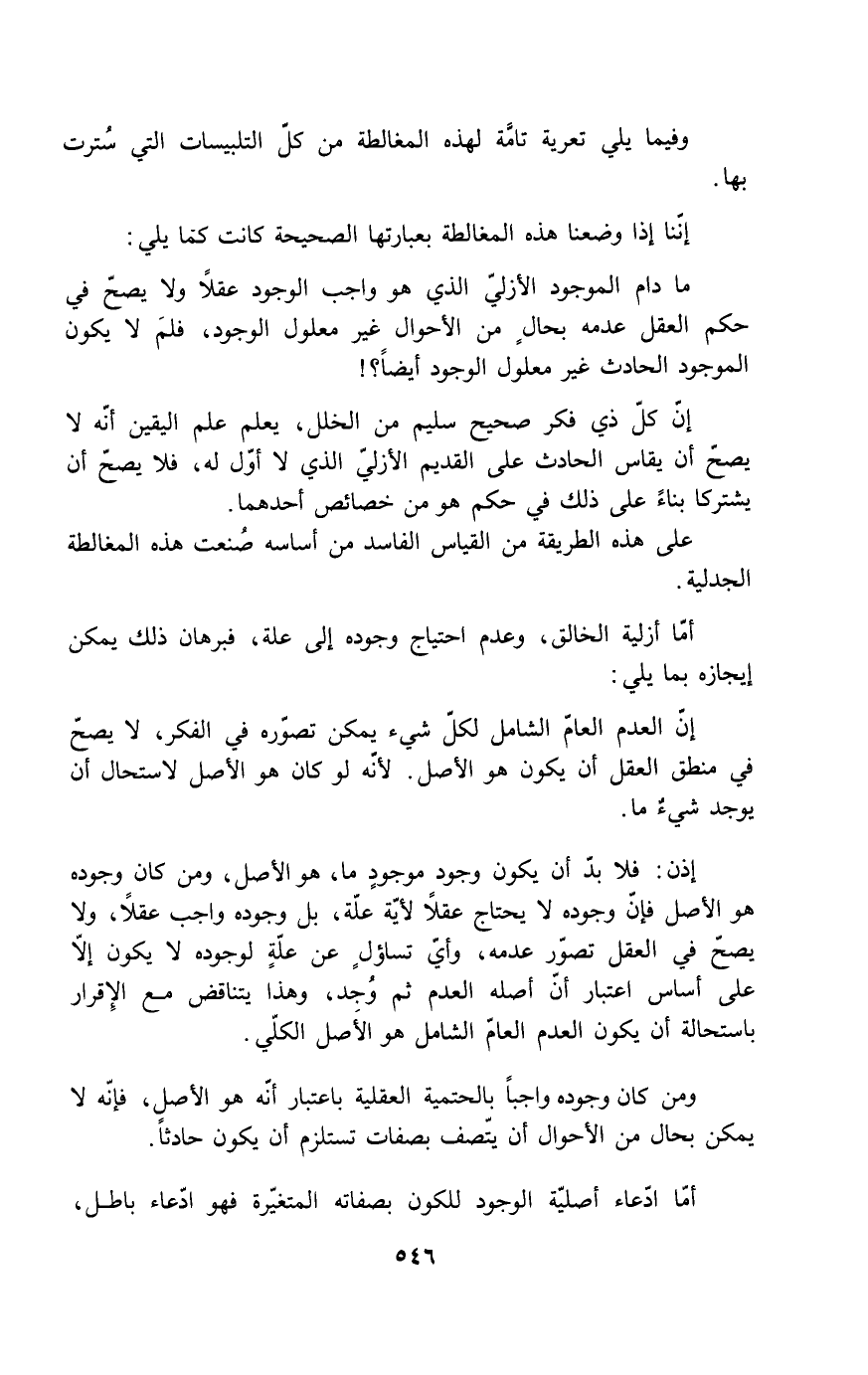 إن العدم العام الشامل لكل شيء يمكن تصوره في الفكر، لا يصح في منطق العقل أن يكون هو الأصل. لأنه لو كان هو الأصل لاستحال أن يوجد شيءٌ ما.
