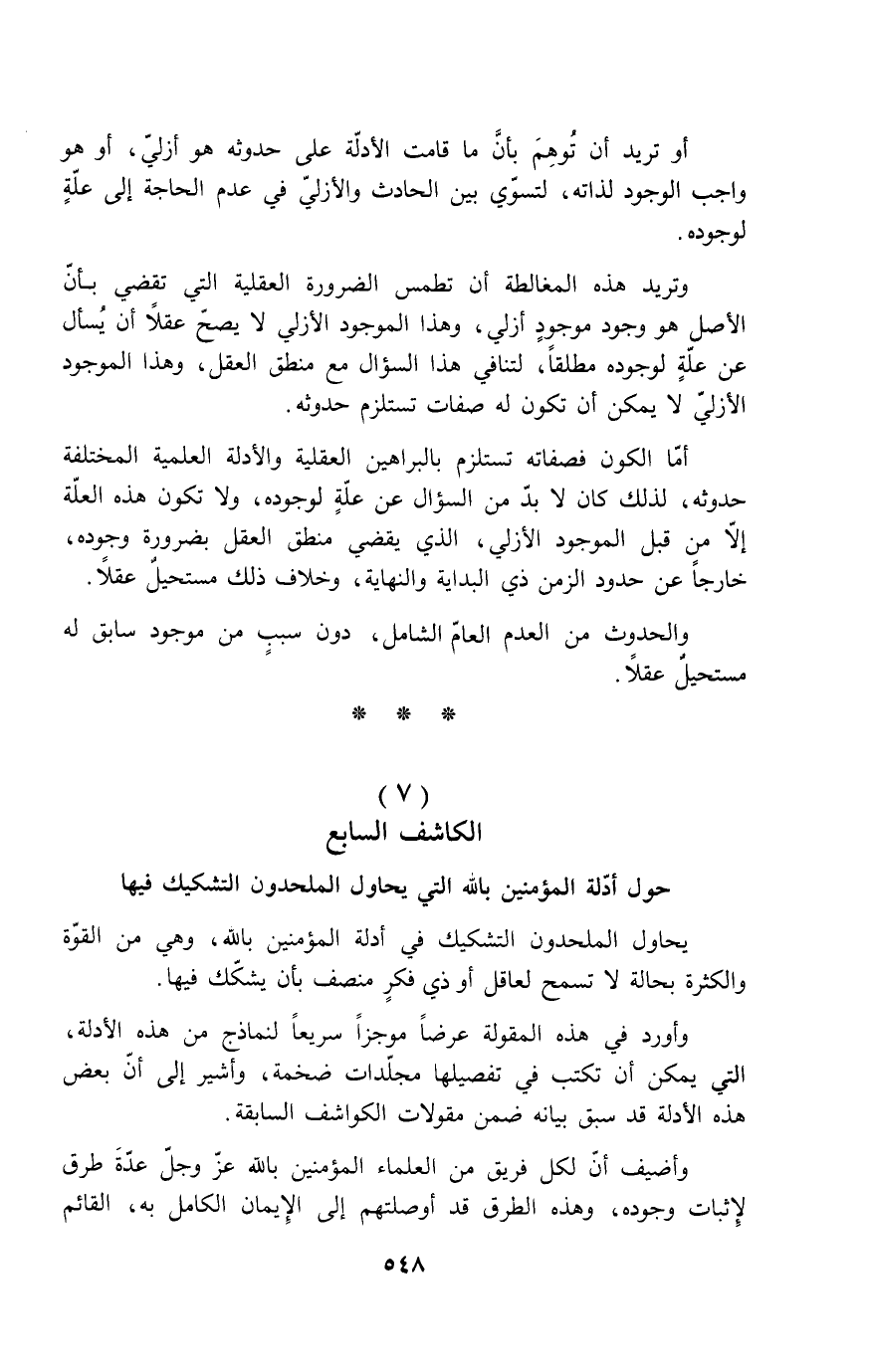 أما الكون فصفاته تستلزم بالبراهين العقلية والأدلة العلمية المختلفة حدوثه، لذلك كان لا بد من السؤال عن علةٍ لوجوده، ولا تكون هذه العلة إلا من قبل الموجود الأزلي، الذي يقضي منطق العقل بضرورة وجوده، خارجاً عن حدود الزمن ذي البداية والنهاية، وخلاف ذلك مستحيل عقلاً.