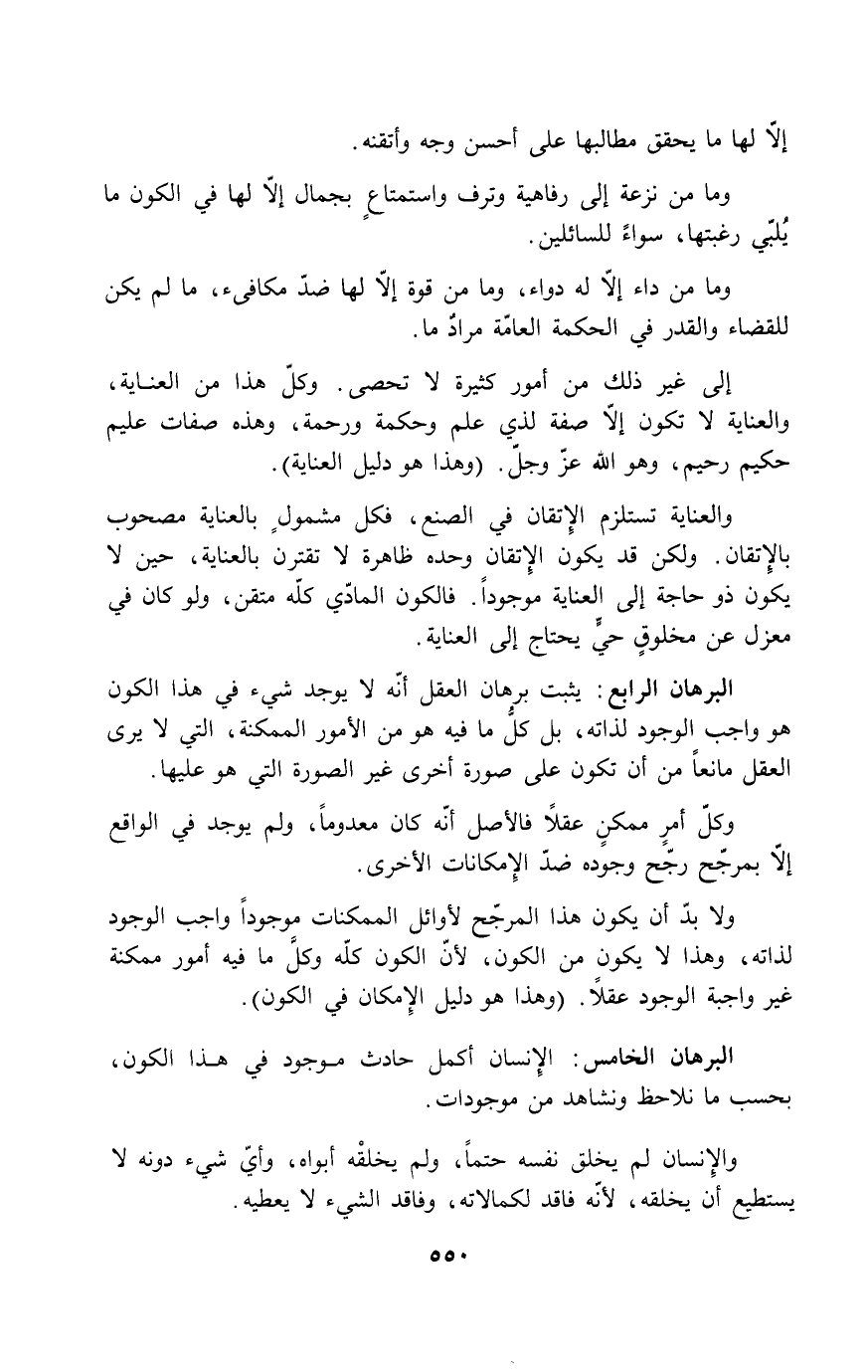 إلى غير ذلك من أمور كثيرة لا تحصى. وكل هذا من العناية، والعناية لا تكون إلا صفة لذي علم وحكمة ورحمة، وهذه صفات عليم حكيم رحيم، وهو الله عز وجل. (وهذا هو دليل العناية) .