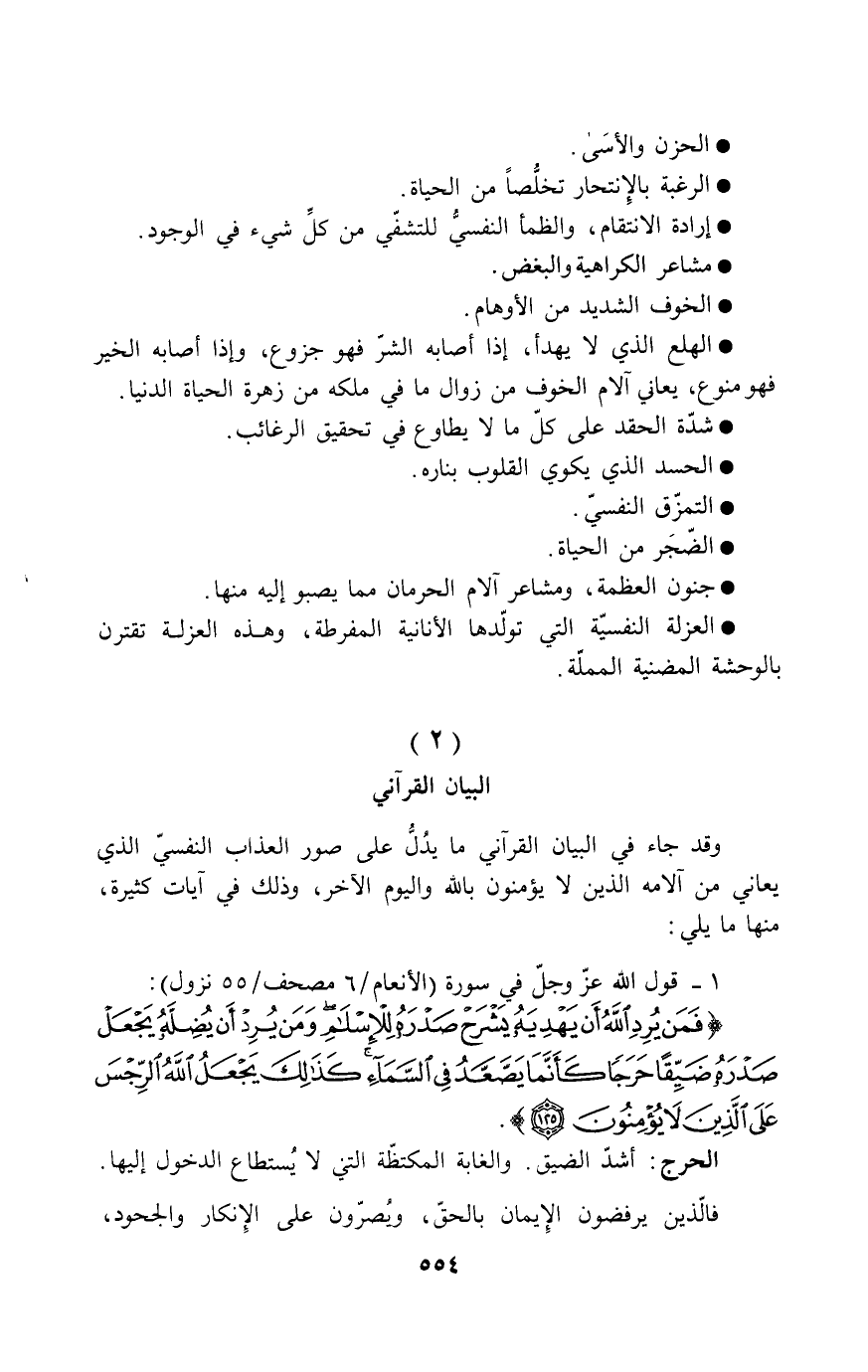 وقد جاء في البيان القرآني ما يدُلُّ على صور العذاب النفسي الذي يعاني من آلامه الذين لا يؤمنون بالله واليوم الآخر، وذلك في آيات كثيرة، منها ما يلي: