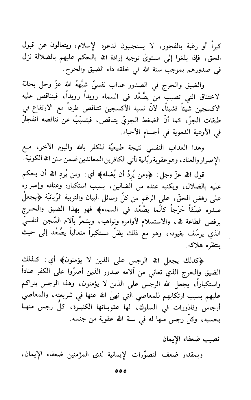 قول الله عز وجل {ومن يرد أن يضله} أي: ومن يرد الله أن يحكم عليه بالضلال، ويكتبه عنده من الضالين، بسبب استكباره وعناده وإصراره على رفض الحق، على الرغم من كل وسائل البيان والتربية الربانية {يجعل صدره ضيقاً حرجاً كأنما يصعد في السماء} فهو بهذا الضيق والحرج يرفض الطاعة لله، والاستسلام لأوامره ونواهيه، ويشعرُ بآلام السجن النفسي الذي يرسف بقيوده، وهو مع ذلك يظل مستكبراً متعالياً يصَّعَّد إلى حيث ينتظره هلاكه.