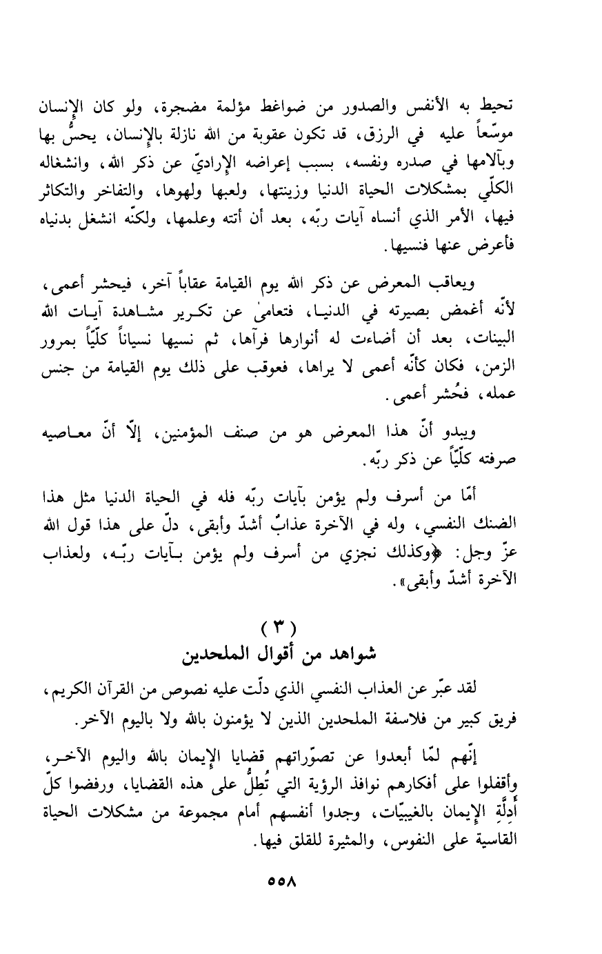 أما من أسرف ولم يؤمن بآيات ربه فله في الحياة الدنيا مثل هذا الضنك النفسي، وله في الآخرة عذاب أشد وأبقى، دل على هذا قول الله عز وجل: {وكذلك نجزي من أسرف ومل يؤمن بآيات ربه، ولعذاب الآخرة أشد وأبقى".