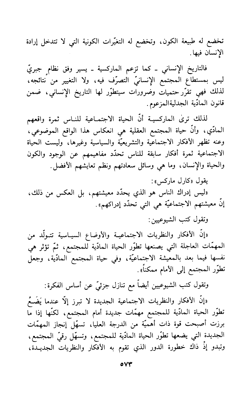 " إن الأفكار والنظريات الاجتماعية الجديدة لا تبرز إلا عندما يَضَعُ تطور الحياة المادية للمجتمع مهمات جديدة أمام المجتمع، لكنها إذا ما برزت أصبحت قوة ذات أهمية من الدرجة العليا، تسهل إنجاز المهمات الجديدة التي يضعها تطور الحياة المادية للمجتمع، وتسهل رقي المجتمع، وتبدو إذ ذاك خطورة الدور الذي تقوم به الأفكار والنظريات الجديدة،