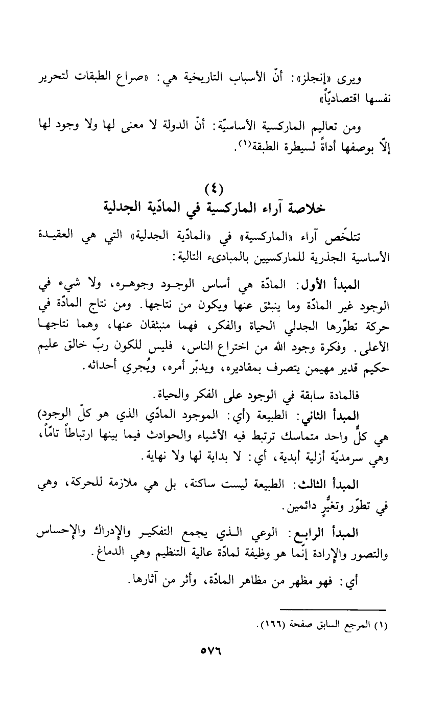 تتلخص آراء "الماركسية" في "المادية الجدلية" التي هي العقيدة الأساسية الجذرية للماركسيين بالمبادئ التالية: