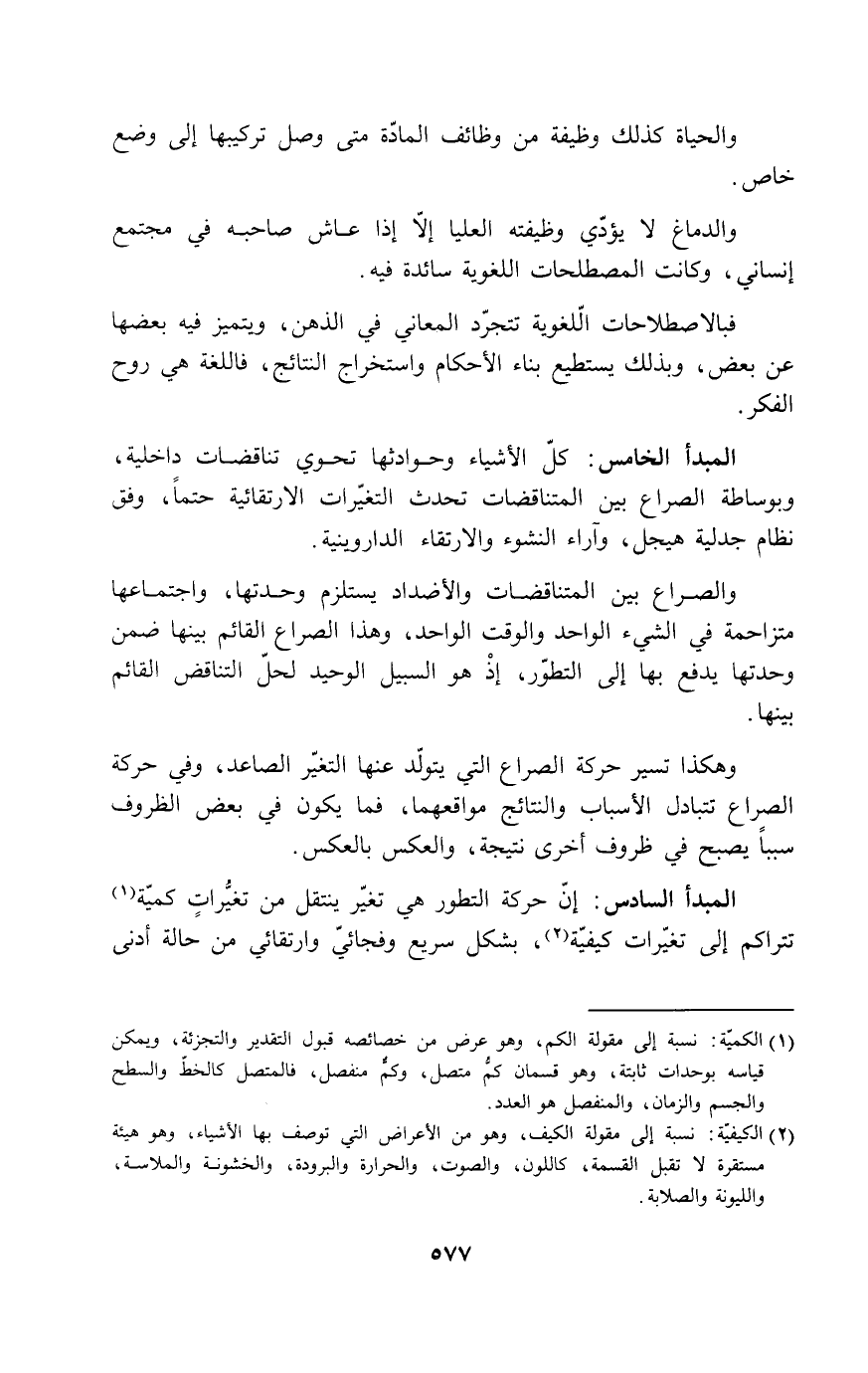 المبدأ الخامس: كل الأشياء وحوادثها تحوي تناقضات داخلية، وبوساطة الصراع بين المتناقضات تحدث التغيرات الارتقائية حتماً، وفق نظام جدلية هيجل، وآراء النشوء والارتقاء الداروينية.