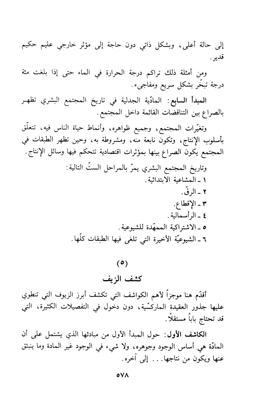 الكاشف الأول: حول المبدأ الأول من مبادئها الذي يشتمل على أن المادة هي أساس الوجود وجوهره، ولا شيء في الوجود غير المادة وما ينبثق عنها ويكون من نتاجها.... إلى آخره.