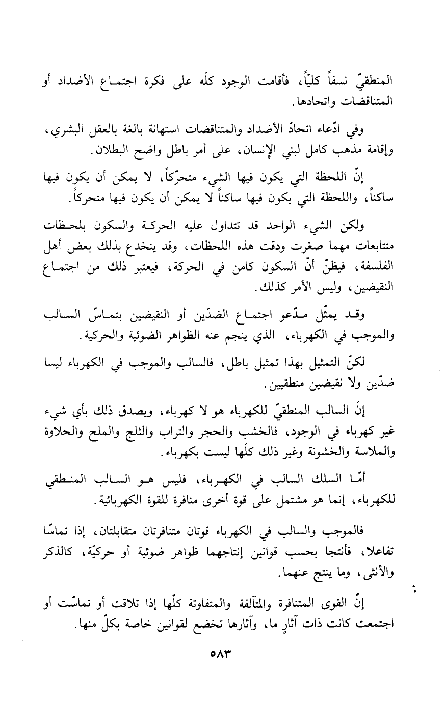 إن السالب المنطقي للكهرباء هو لا كهرباء، ويصدق ذلك بأي شيء غير كهرباء في الوجود، فالخشب والحجر والتراب والثلج والملح والحلاوة والملاسة والخشونة وغير ذلك كلها ليست بكهرباء.