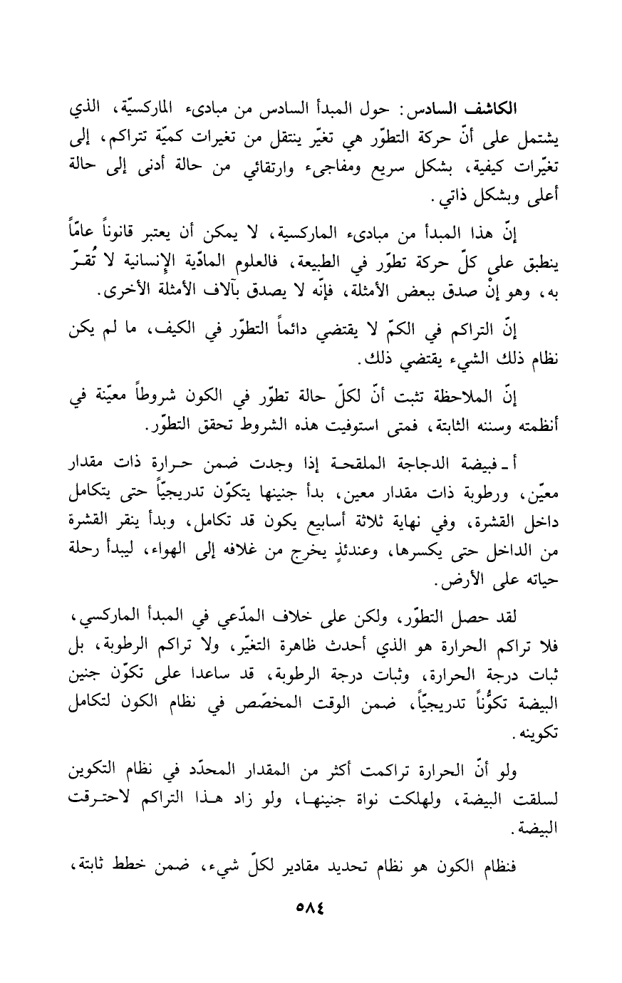 لقد حصل التطور، ولكن على خلاف المدعي في المبدأ الماركسي، فلا تراكم الحرارة هو الذي أحدث ظاهرة التغير، ولا تراكم الرطوبة، بل ثبات درجة الحرارة، وثبات درجة الرطوبة، قد ساعدا على تكون جنين البيضة تكوناً تدريجياً، ضمن الوقت المخصص في نظام الكون لتكامل تكوينه.