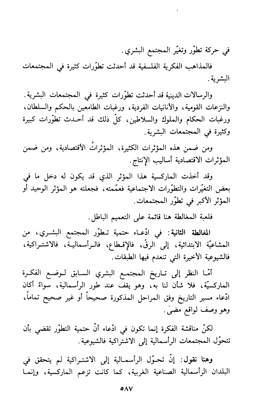 أما النظر إلى تاريخ المجتمع البشري السابق لوضع الفكرة الماركسية، فلا شأن لنا به، وهو يقف عن طور الرأسمالية، سواءٌ أكان ادعاء مسير التاريخ وفق المراحل المذكورة صحيحاً أو غير صحيح تماماً، وهو وصف لواقع مضى.